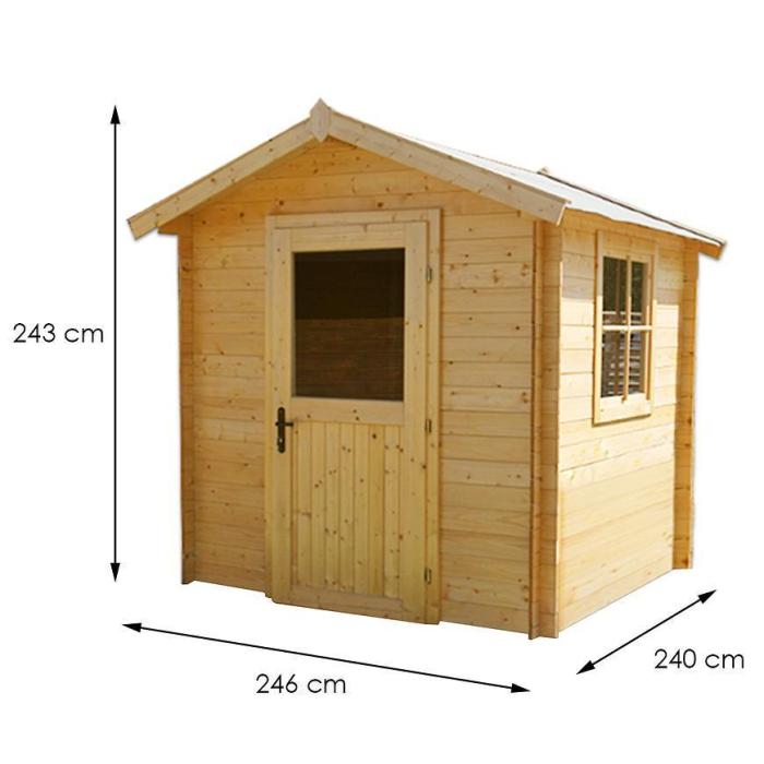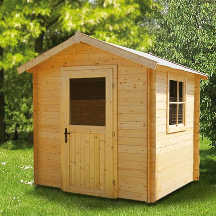 Domek ogrodowy Maczek został wykonany z surowego drewna świerkowego oraz posiada dwuspadowy dach obitym papą asfaltową. Dodatkowo domek posiada okna i drzwi jednoskrzydłowe przeszklone.