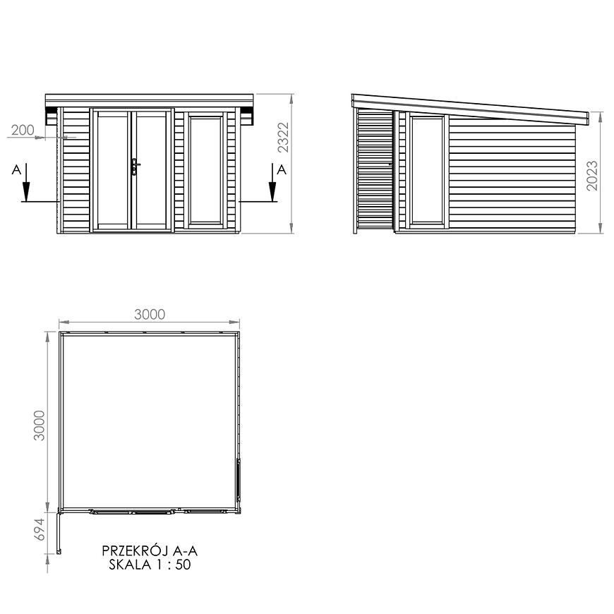 Domek ma wymiary 300 × 369,4 cm, wysokość 232,2 cm i oferuje 8,9 m² powierzchni wewnętrznej, co zapewnia wystarczająco dużo przestrzeni do różnych zastosowań. Ścianki o grubości 28 mm gwarantują stabilność i solidność całej konstrukcji, a wykończenie w naturalnym kolorze drewna podkreśla jego klasyczny, a jednocześnie nowoczesny styl.