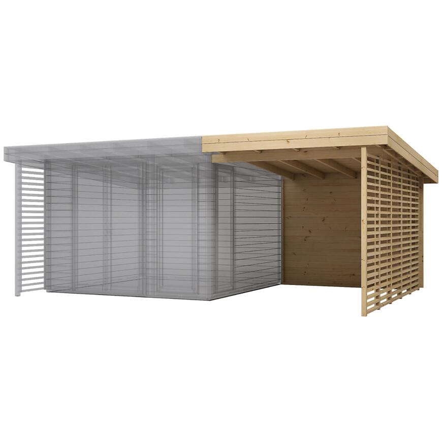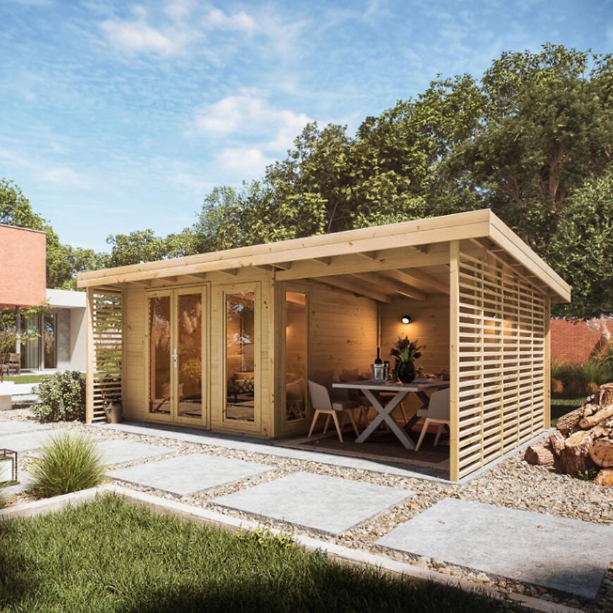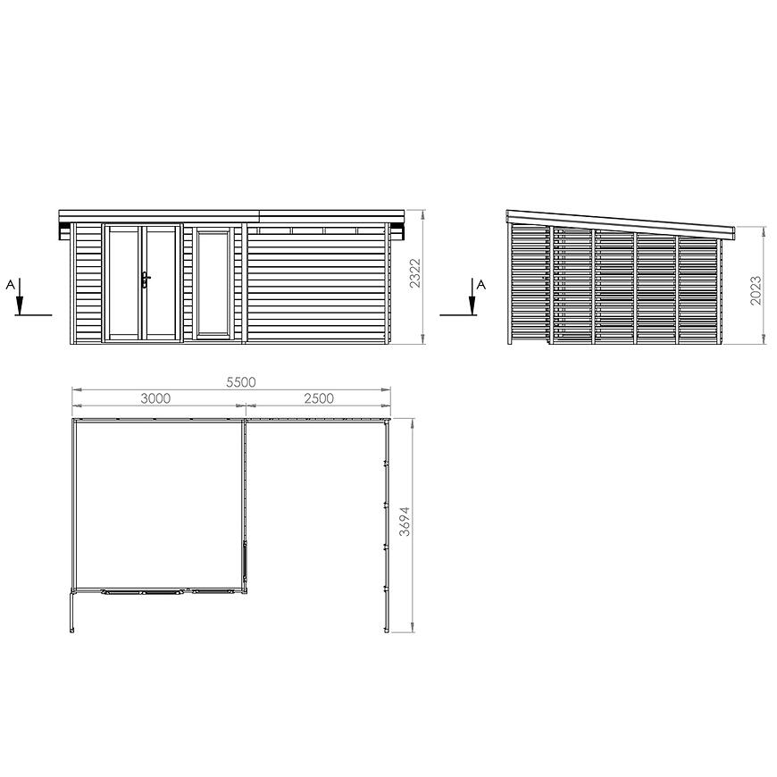 Konstrukcja domku ma wymiary 550 × 369,4 cm i wysokość 232,2 cm, z czego na część wewnętrzną przypada 8,9 m², a dodatkowy taras o powierzchni 7,4 m² stanowi idealne miejsce na relaks na świeżym powietrzu. Ściany o grubości 28 mm zapewniają trwałość i stabilność, a naturalne wykończenie drewna podkreśla nowoczesny, a zarazem przytulny charakter budynku.