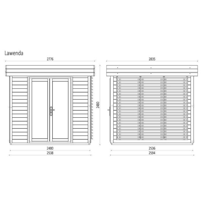 Domek ogrodowy LAWENDA 250x250 został wykonany z surowego drewna świerkowego oraz posiada prosty dach obitym papą asfaltową. Dodatkowo domek posiada przeszklone podwójne drzwi. Domek ma frontowe przeszklenia – posiada 3 okna z brązowymi szybami typu antisol.