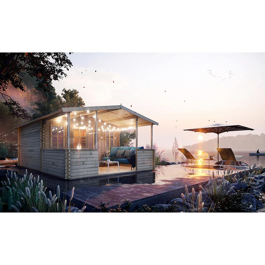 Model wyposażony jest w dwuskrzydłowe, przeszklone drzwi, które ułatwiają dostęp do wnętrza i wpuszczają naturalne światło, tworząc przyjemną atmosferę w pomieszczeniu. Domek nie posiada okien ani podłogi w zestawie, co pozwala na indywidualne dopasowanie wnętrza do potrzeb użytkownika. Dach o konstrukcji dwuspadowej pokryty jest papą asfaltową, gwarantując ochronę przed deszczem i innymi warunkami atmosferycznymi.