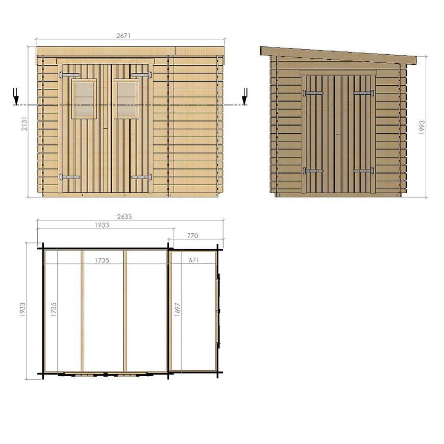 Wymiary: Szerokość 267,1 cm, głębokość 193,3 cm, wysokość 213,1 cm – powierzchnia użytkowa 4,7 m².