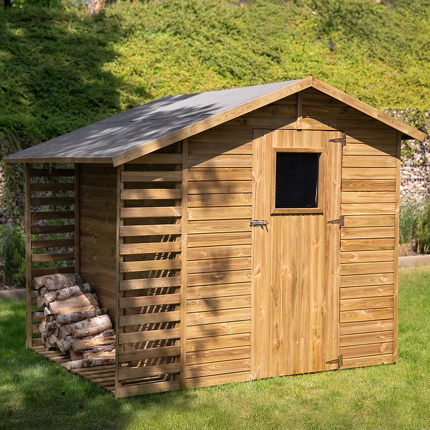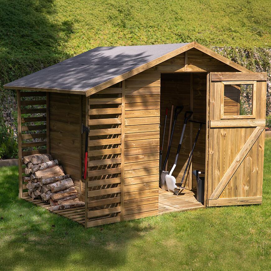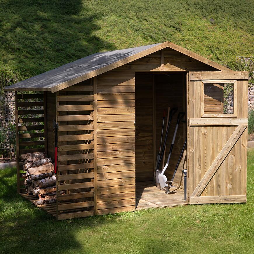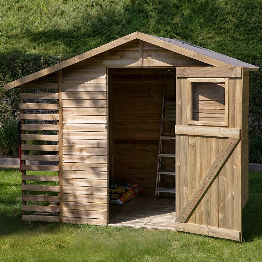 Domek ogrodowy Torino II 258x210x211 cm to funkcjonalny i wytrzymały domek drewniany, idealny do przechowywania narzędzi, sprzętu ogrodowego i drobnych akcesoriów.