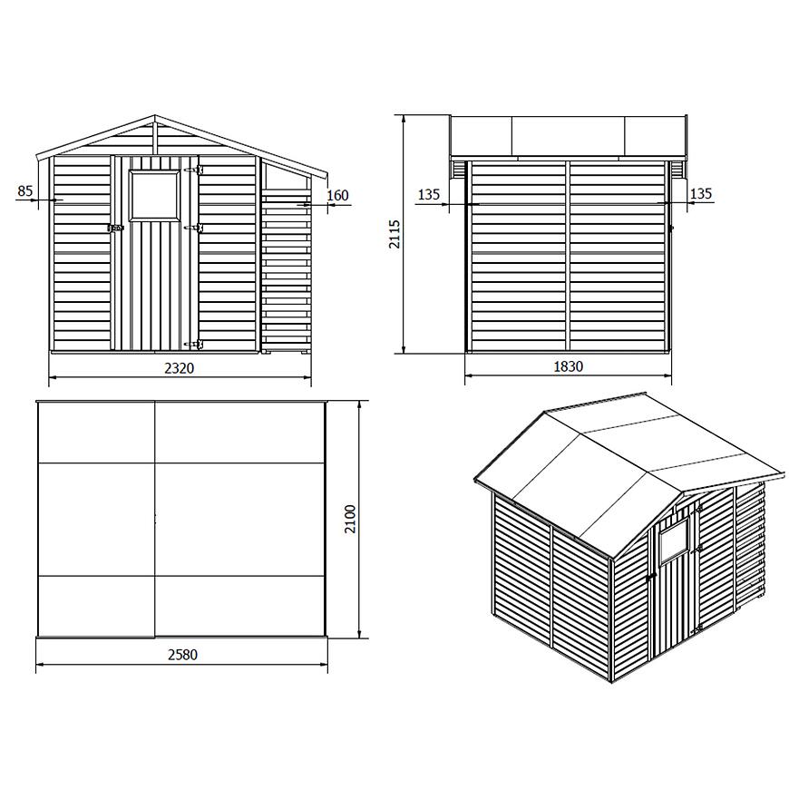 • Wymiary: 258 x 210 x 211 cm – powierzchnia użytkowa 3,25 m², doskonała do małych ogrodów.