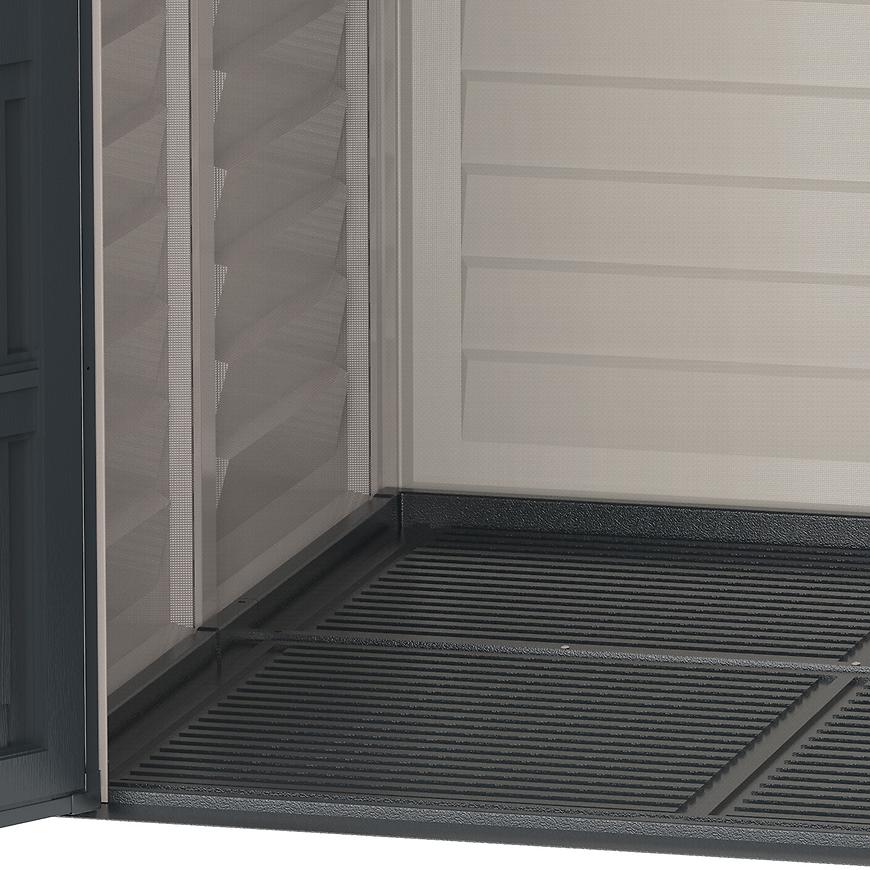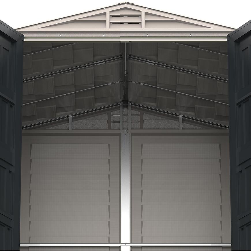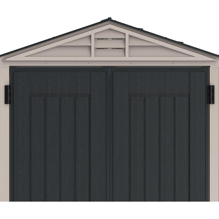 Domek wyposażony jest w szerokie podwójne drzwi, które ułatwiają dostęp do wnętrza, a także zamykają się na klamki z oczkami na kłódkę, zapewniając bezpieczeństwo przechowywanych przedmiotów. System wentylacji powietrza w postaci szczelinowej kratki na szczytowej fasadzie zapewnia odpowiednią cyrkulację powietrza, co pomaga utrzymać odpowiednią wilgotność wewnątrz. W zestawie znajduje się również podłoga, co zwiększa stabilność i komfort użytkowania domku.