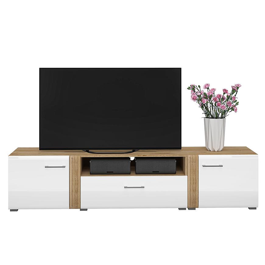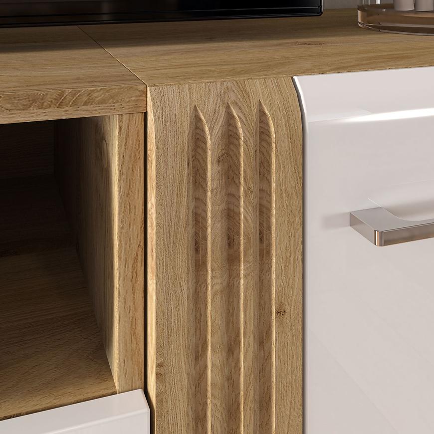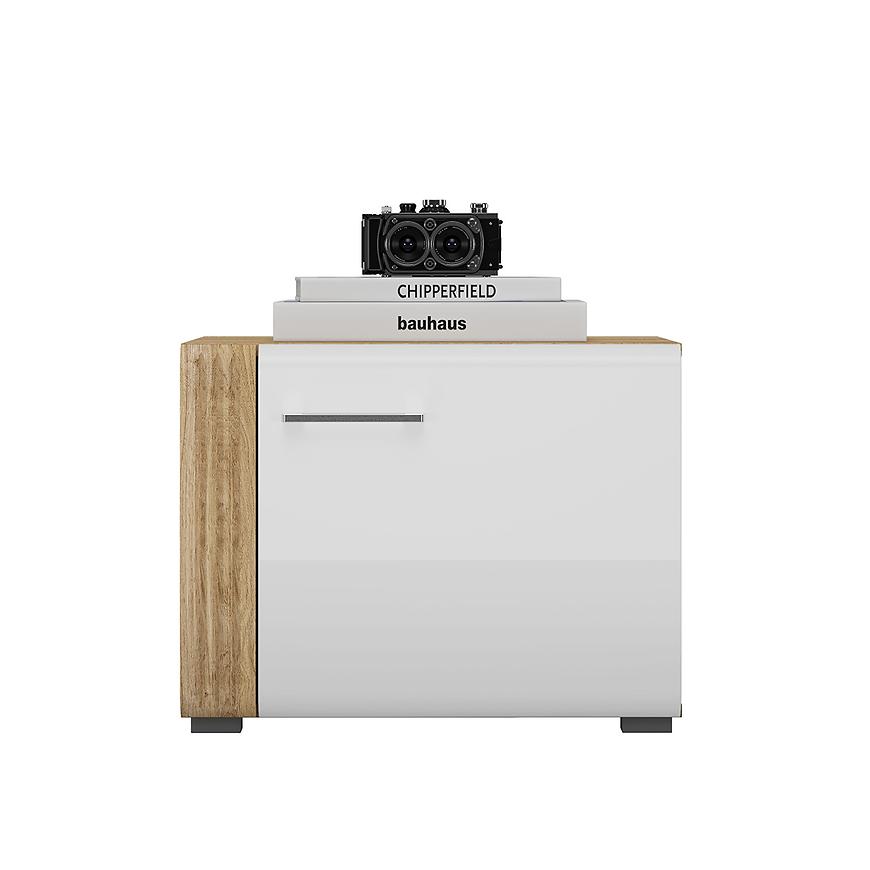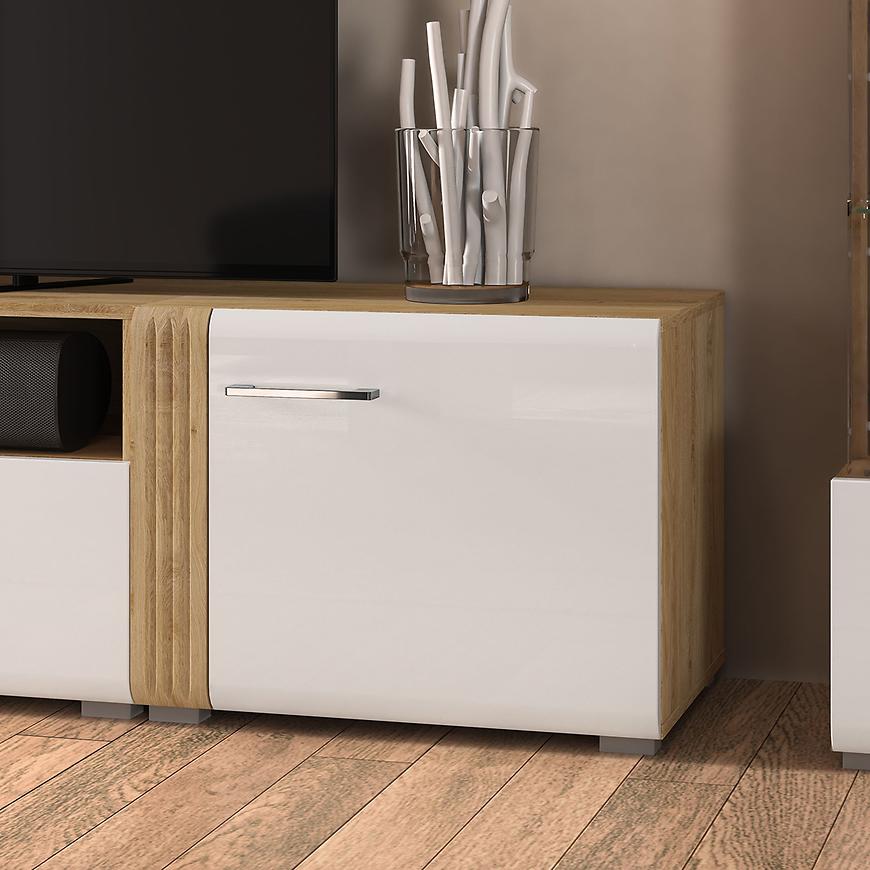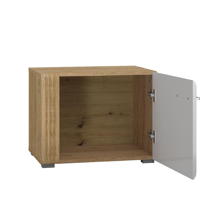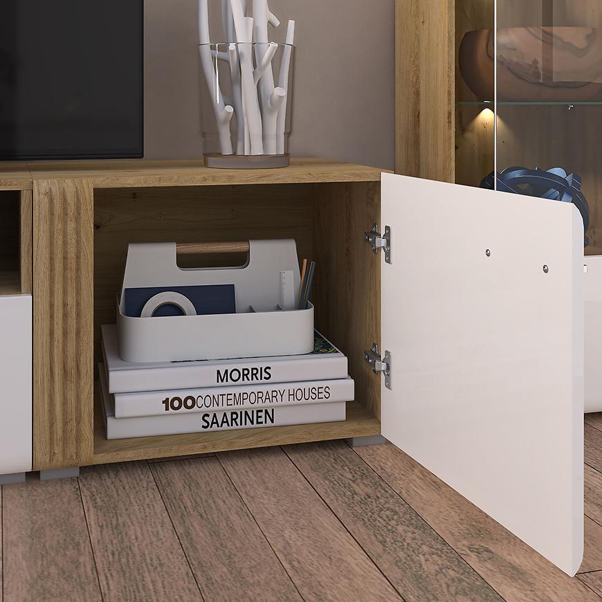 Jednodrzwiowy układ zapewnia dodatkowe miejsce do przechowywania, umożliwiając jednocześnie utrzymanie porządku w otoczeniu. Kolor biały frontów nadaje meblowi świeży, nowoczesny wygląd, podczas gdy korpus w dębie castello dodaje ciepła i naturalnego charakteru.