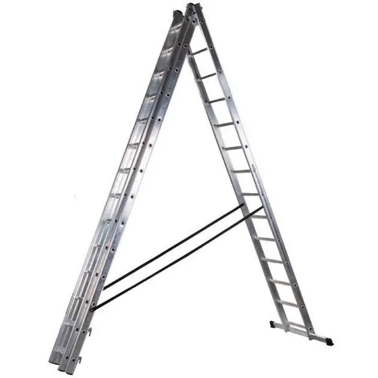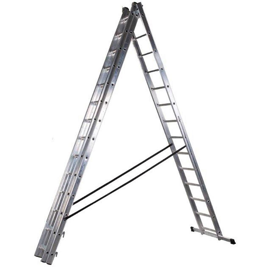 Model ten sprawdzi się jako drabina przystawna, rozkładana i rozsuwana, oferując szerokie możliwości zastosowania. Lekką, aluminiową konstrukcję uzupełniają solidne podłużnice, stalowe prowadnice malowane proszkowo oraz zapadkowe haki zabezpieczające, które chronią przed przypadkowym wypięciem elementów. Stabilność konstrukcji zwiększają taśmy zabezpieczające oraz szeroki stabilizator poprzeczny zapobiegający przewróceniu.
