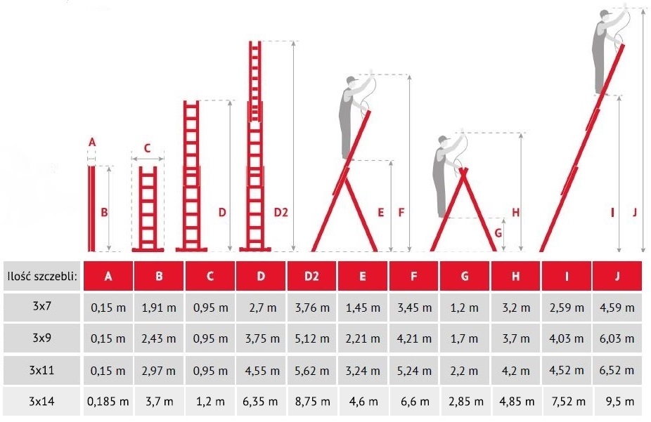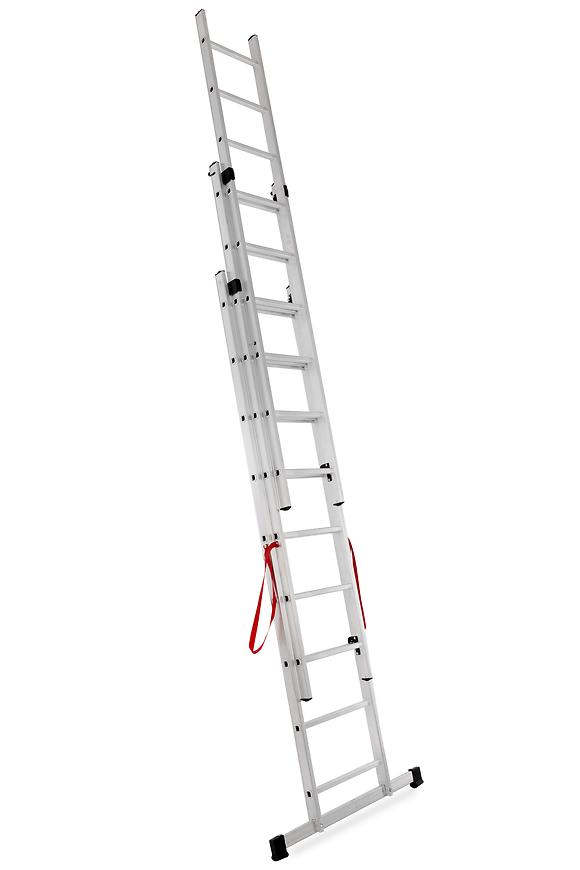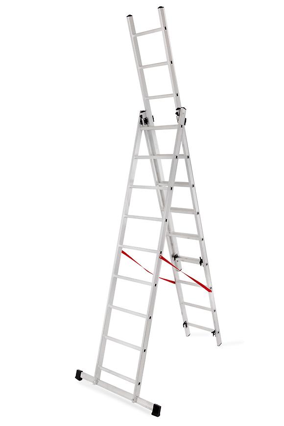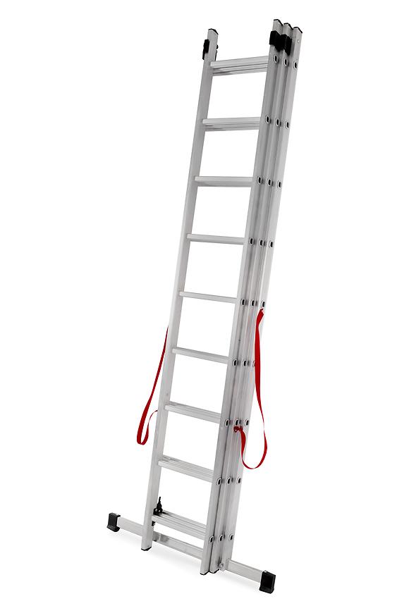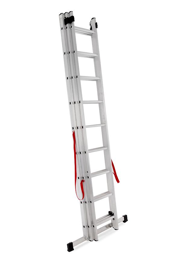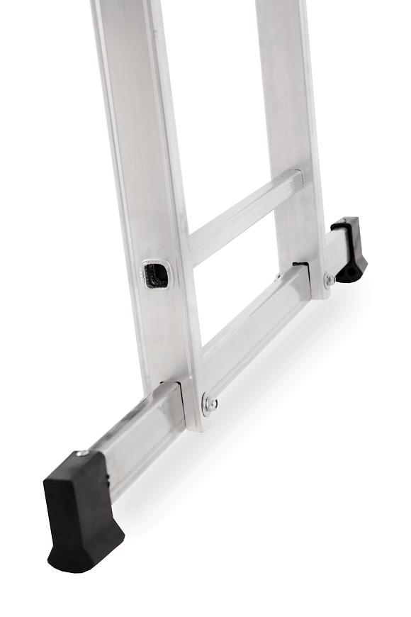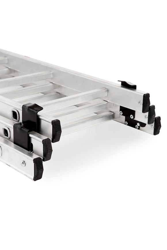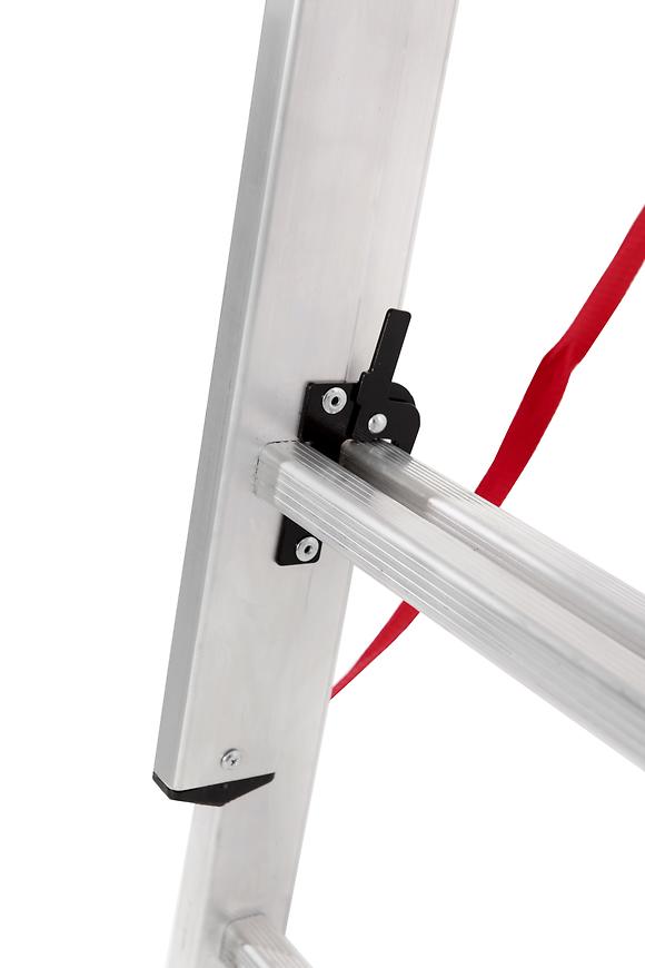 Model ten sprawdzi się jako drabina przystawna, rozkładana i rozsuwana, oferując szerokie możliwości zastosowania. Lekką, aluminiową konstrukcję uzupełniają solidne podłużnice, stalowe prowadnice malowane proszkowo oraz zapadkowe haki zabezpieczające, które chronią przed przypadkowym wypięciem elementów. Stabilność konstrukcji zwiększają taśmy zabezpieczające oraz szeroki stabilizator poprzeczny zapobiegający przewróceniu.