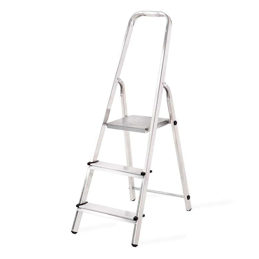 Drabina posiada trzy szerokie aluminiowe stopnie, a także solidny podest o wymiarach 25x25 cm, który gwarantuje stabilność podczas pracy. Zarówno stopnie, jak i podest są ryflowane, co zwiększa przyczepność i zapewnia pewność kroków podczas użytkowania. Dodatkowo, wysoki kabłąk zapewnia wsparcie podczas wchodzenia i schodzenia.