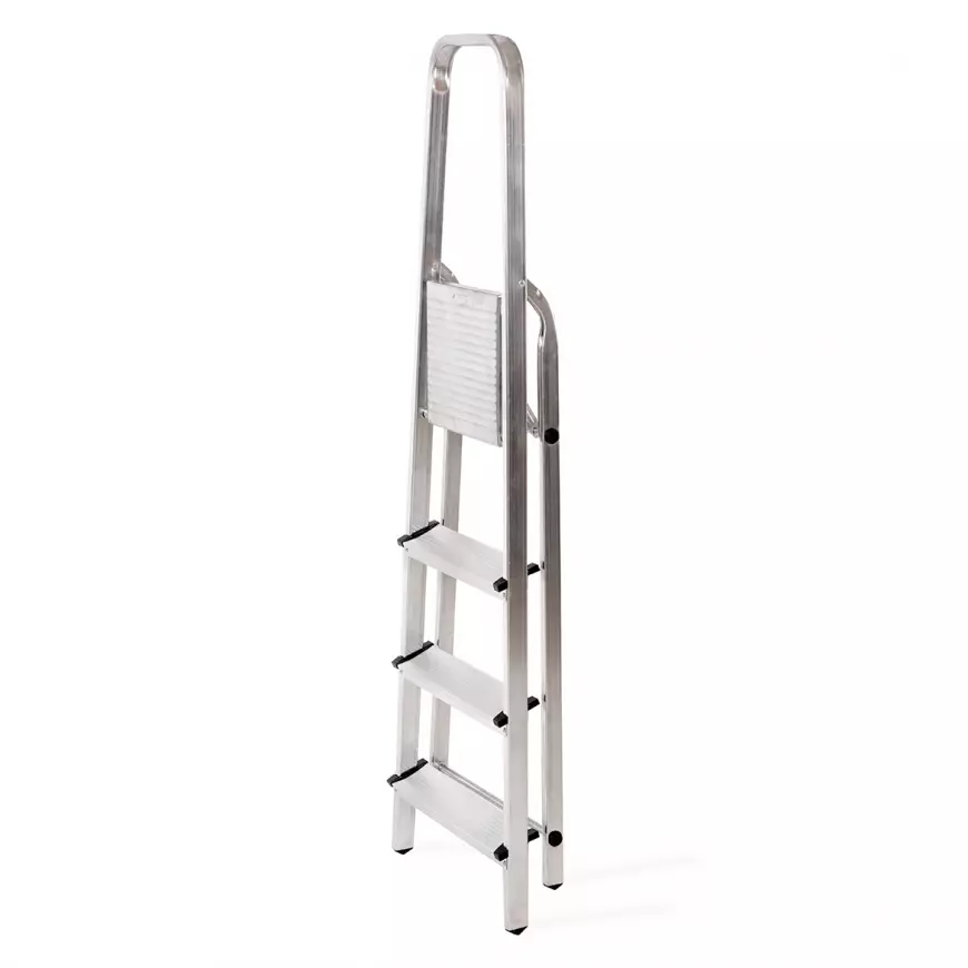 Lekka, a jednocześnie stabilna konstrukcja drabiny aluminiowej zapewnia łatwość przenoszenia oraz pewność podczas użytkowania. Bezpieczny podest o wymiarach 25x25 cm stanowi stabilną platformę, a szerokie aluminiowe stopnie oraz wysoki kabłąk ułatwiają wejście i schodzenie. Ryflowane stopnie i podest zwiększają przyczepność, zapewniając dodatkową pewność kroków.