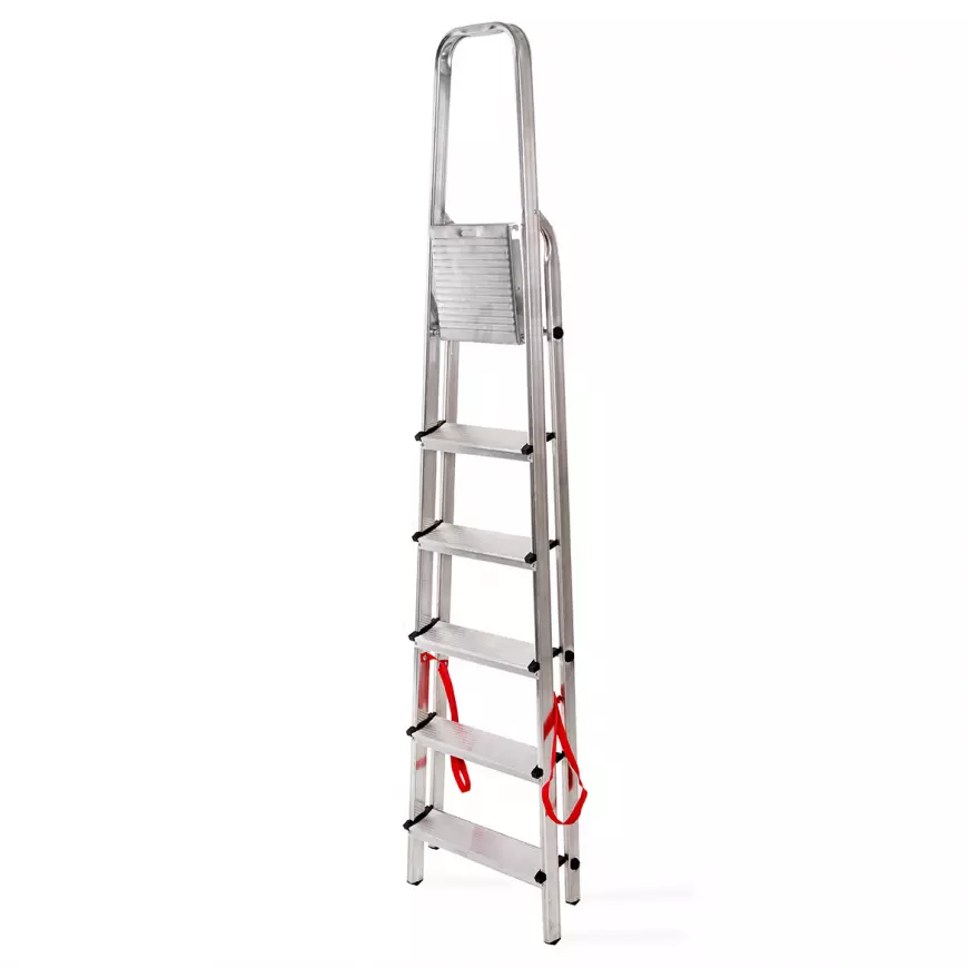 Lekka, a jednocześnie stabilna konstrukcja drabiny aluminiowej umożliwia łatwe przenoszenie i ustawianie, a bezpieczny podest o wymiarach 25x25 cm stanowi stabilną platformę dla użytkownika. Szerokie aluminiowe stopnie oraz wysoki kabłąk ułatwiają wejście i schodzenie. Ryflowane stopnie i podest zwiększają przyczepność, zapewniając pewność kroków nawet podczas prac w trudnych warunkach.