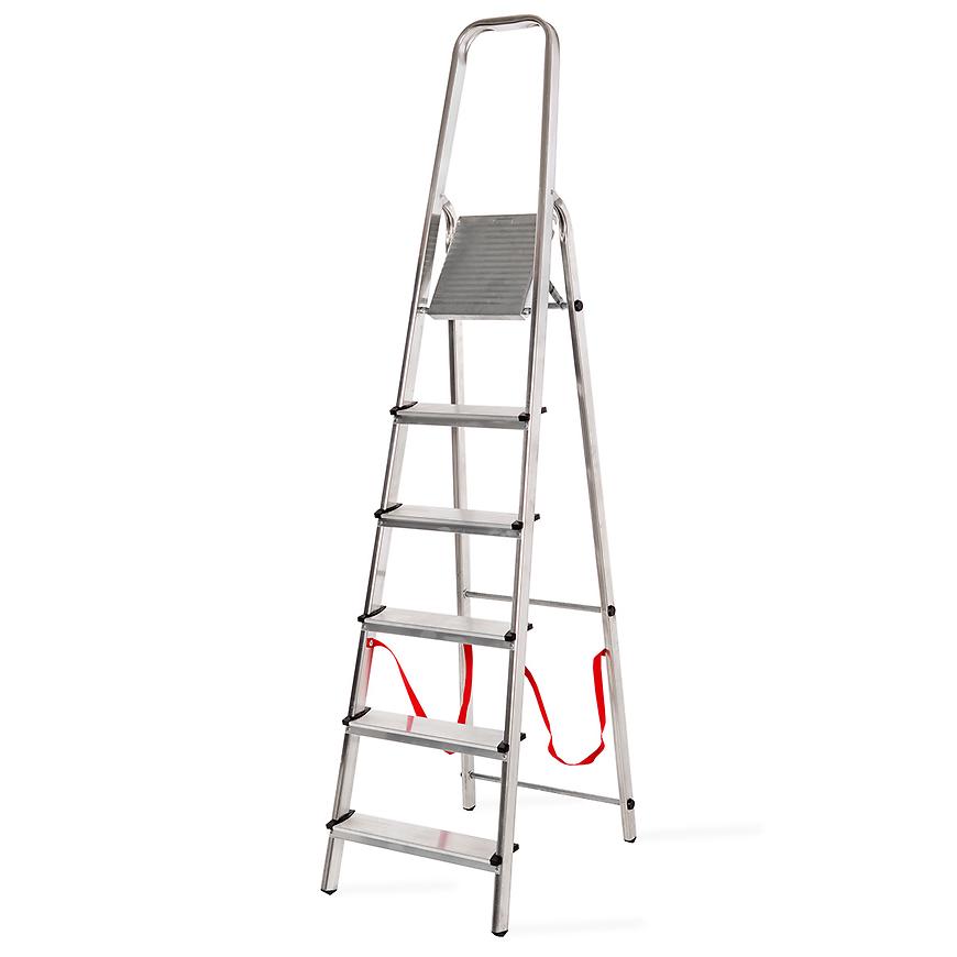 Lekka, a jednocześnie stabilna konstrukcja drabiny aluminiowej umożliwia łatwe przenoszenie i ustawianie, a bezpieczny podest o wymiarach 25x25 cm stanowi stabilną platformę dla użytkownika. Szerokie aluminiowe stopnie oraz wysoki kabłąk ułatwiają wejście i schodzenie. Ryflowane stopnie i podest zwiększają przyczepność, zapewniając pewność kroków nawet podczas prac w trudnych warunkach.