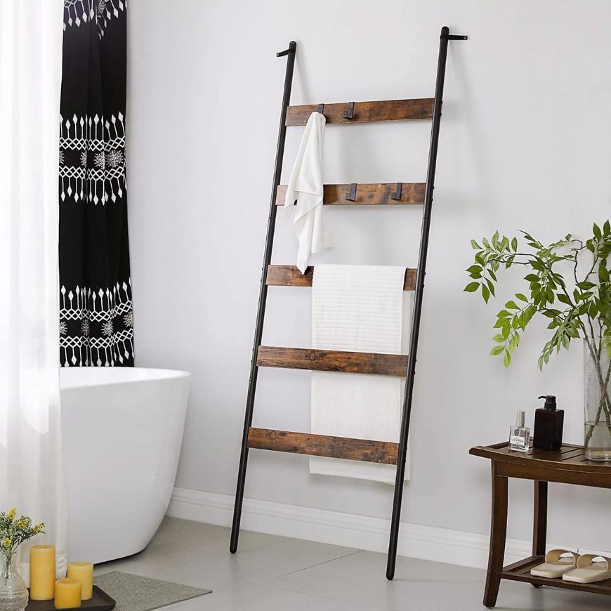 Drabinka łazienkowa Rustic 2 w eleganckim połączeniu brązu i czerni to funkcjonalny i stylowy dodatek do każdej łazienki. Wykonana z trwałej płyty wiórowej laminowanej oraz wytrzymałego metalu, łączy w sobie solidność i nowoczesny design. Dzięki wymiarom 65 cm szerokości i 178 cm wysokości, drabinka oferuje praktyczne miejsce na ręczniki, nie zajmując przy tym dużo miejsca.
