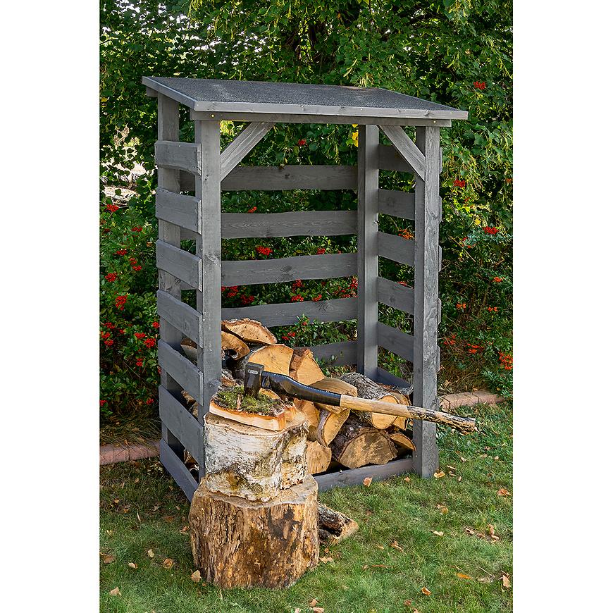 Drewutnia Nevada 122x74x190 cm to praktyczna i wytrzymała konstrukcja z drewna świerkowego, stworzona z myślą o wygodnym przechowywaniu drewna opałowego w ogrodzie lub przydomowej przestrzeni. Klasyczny design w kolorze szarym wkomponuje się w każdą aranżację zewnętrzną.