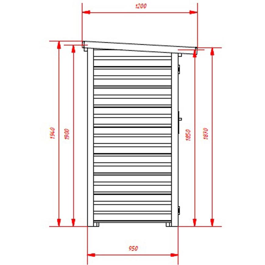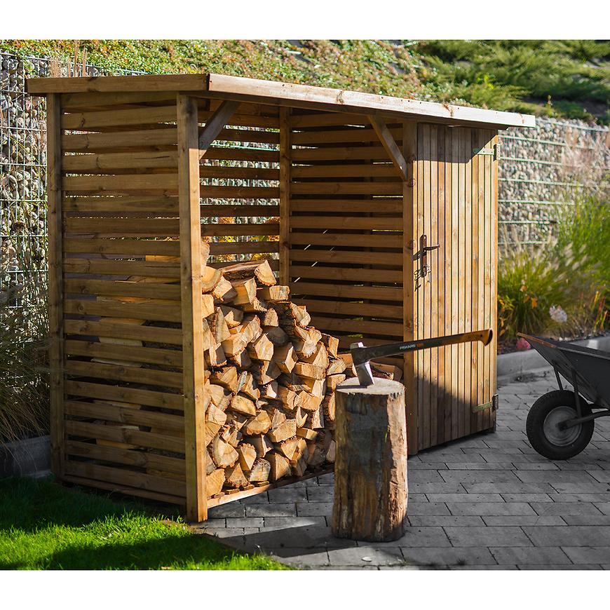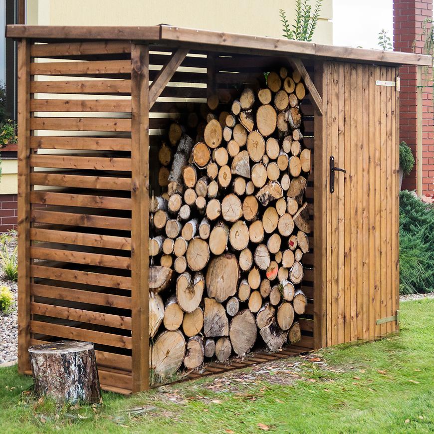 Dodatkowym atutem drewutni Bergen jest jednoskrzydłowa szafa z drzwiami nieprzeszklonymi, w której można przechowywać narzędzia ogrodowe, akcesoria do grilla czy drobne sprzęty sezonowe. Szafa chroni przed wiatrem i deszczem, zwiększając funkcjonalność drewutni.