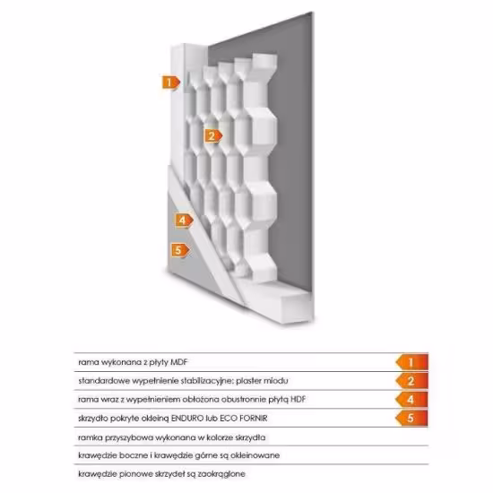 Drzwi Amaro 1 80P wykonane są w technologii puszkowej, co zapewnia lekkość skrzydła przy zachowaniu wysokiej trwałości. Wypełnienie typu plaster miodu gwarantuje stabilność i odporność na odkształcenia, a powierzchnia pokryta okleiną Enduro chroni drzwi przed zarysowaniami, wilgocią i codziennym zużyciem. Krawędzie typu Soft Line zapewniają subtelny wygląd i bezpieczeństwo – brak ostrych kantów jest praktyczny w domach z dziećmi.