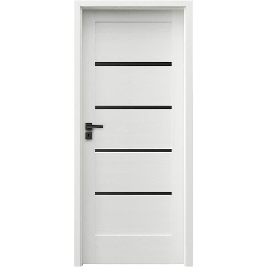 Drzwi Trim Lite A.4 90P posiadają trzy zawiasy, zamek Klucz 72 oraz elegancką czarną szybę, wprowadzającą subtelne światło i nadającą nowoczesnego charakteru. Model ma prawe otwieranie, a krawędzie typu Felzkant zapewniają idealne przyleganie do ościeżnicy i estetyczny wygląd skrzydła.
