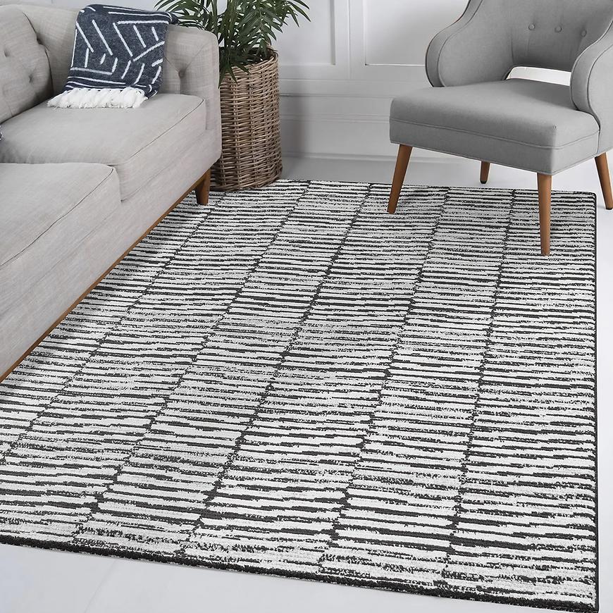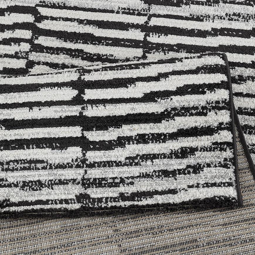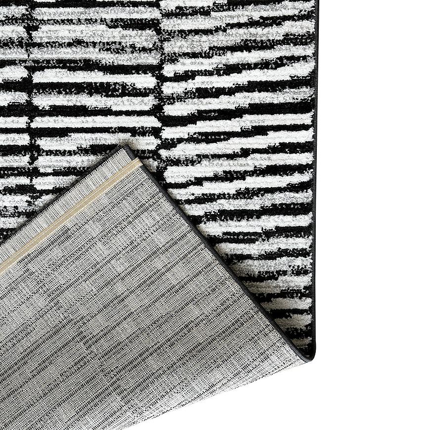 Abstrakcyjny wzór dywanu łączy w sobie odcienie czerni i beżów, tworząc unikalną kompozycję. Kontrast między tymi dwoma kolorami dodaje dywanowi charakteru i sprawia, że staje się on interesującym elementem dekoracyjnym w każdym wnętrzu.