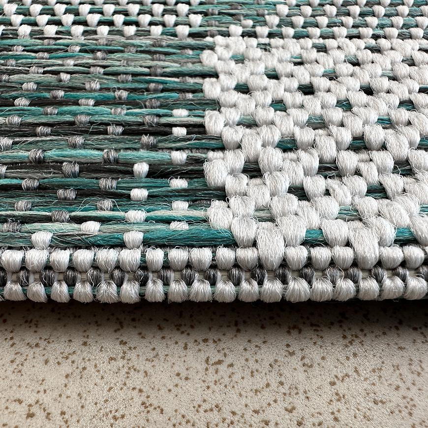 Dywan wykonany jest z 100% z polipropylenu, sposób plecionej maty jest to tak zwane płaskie tkanie (sizal look), dzięki czemu jest wytrzymały i odporny, w szczególności na działanie promieni słonecznych. Charakterystyczną cechą jest brak strzyżonego runa co sprawia, że dywan jest łatwy w utrzymaniu czystości.