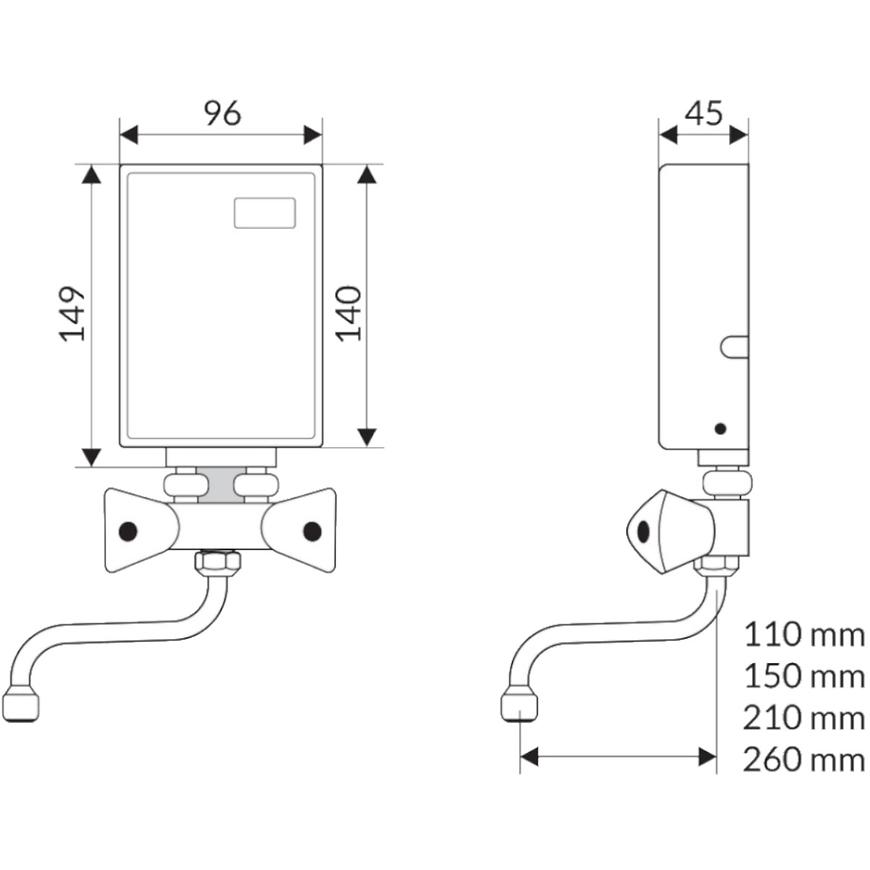 Elektryczny ogrzewacz wody o kompaktowych wymiarach to doskonałe rozwiązanie dla Twojej łazienki. Z szerokością wynoszącą 9,6 cm, wysokością 14,9 cm i głębokością 4,5 cm, ten ogrzewacz jest idealny do małych przestrzeni. Pomimo niewielkich rozmiarów, jest niezwykle wydajny i zapewnia dostęp do ciepłej wody.