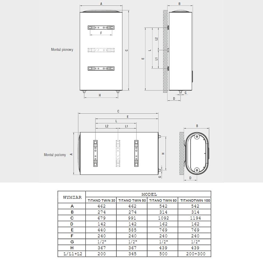 Pomimo olbrzymiej pojemności, podgrzewacz ma kompaktowe wymiary: szerokość 54,2 cm, głębokość 31,4 cm i wysokość 119,4 cm. Jest to ważne dla tych, którzy mają ograniczoną przestrzeń do montażu. Ergonomiczny design ułatwia dostępność urządzenia i konserwację.