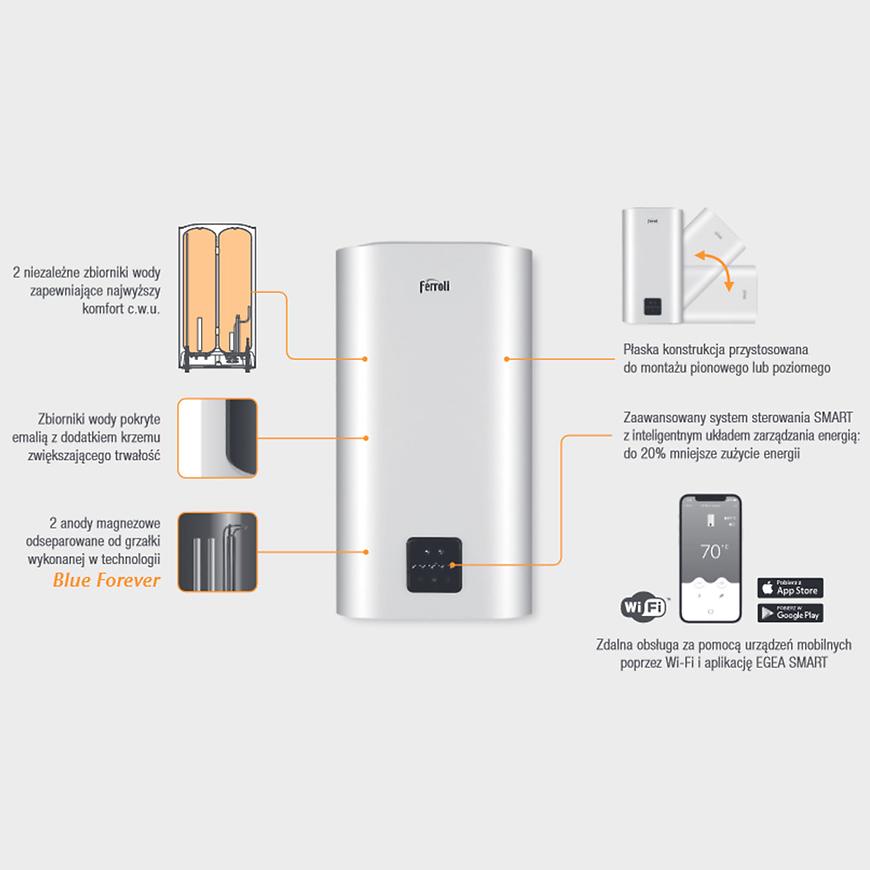 Wyposażony w technologię Wi-Fi, ten model pozwala na zdalne zarządzanie parametrami pracy podgrzewacza za pomocą dedykowanej aplikacji na smartfona. Możesz kontrolować temperaturę wody, planować cykle podgrzewania i dostosowywać urządzenie do swoich indywidualnych potrzeb. To znacznie podnosi komfort użytkowania.