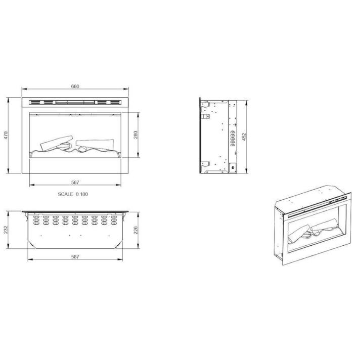Elektryczny wkład do zabudowy we wnęce ściennej, meblowej lub do montażu w dowolnego typu obudowie. Dzięki szybie bez ram możemy cieszyć się widokiem płomieni. Ma możliwość dostosowania jasności, wielkości oraz częstotliwości migotania płomieni, a także różnych motywów kolorystycznych podświetlenia paleniska. Posiada również cyfrowy termostat oraz wbudowany moduł grzewczy co pozwala na regulację temperatury. Dodatkowo wkład ma wielofunkcyjny pilot oraz sterowanie dotykowe na obudowie.
