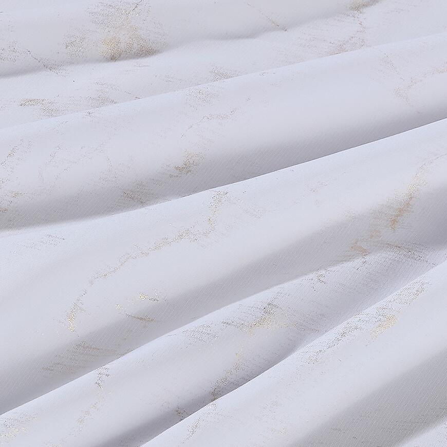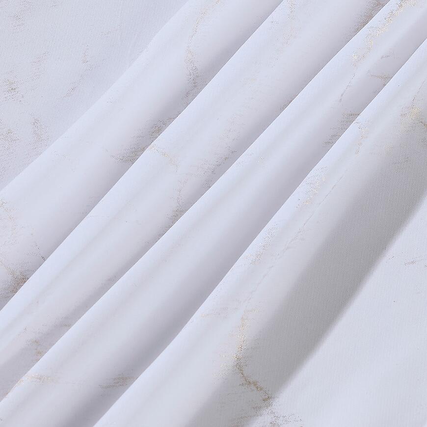 Firana Lena Gold to elegancka dekoracja okienna wykonana w 100% z wysokiej jakości poliestrowego woalu. Biały kolor i subtelny, drukowany wzór sprawiają, że firana delikatnie przepuszcza światło, nie zaciemniając pomieszczenia, co pozwala cieszyć się naturalnym światłem w salonie, kuchni czy sypialni.