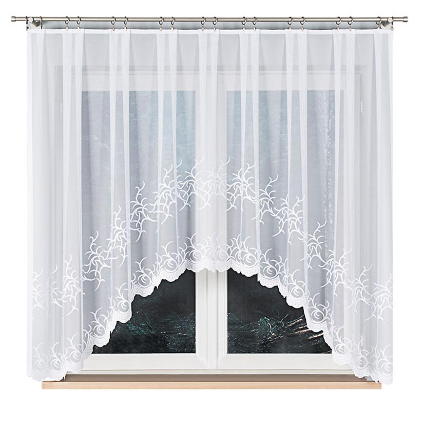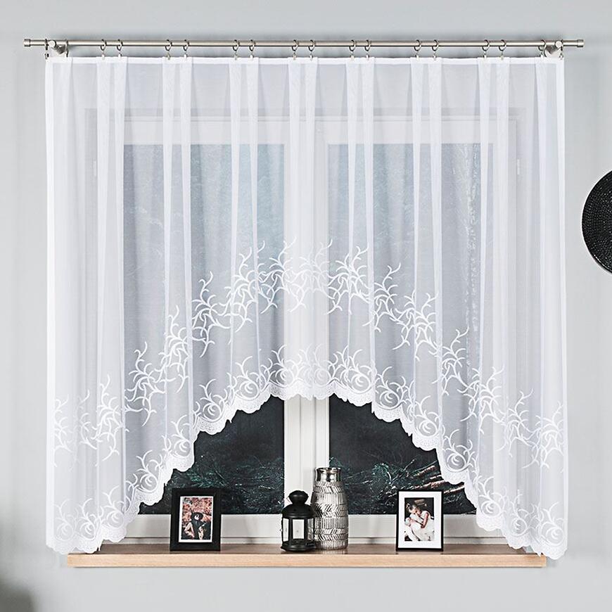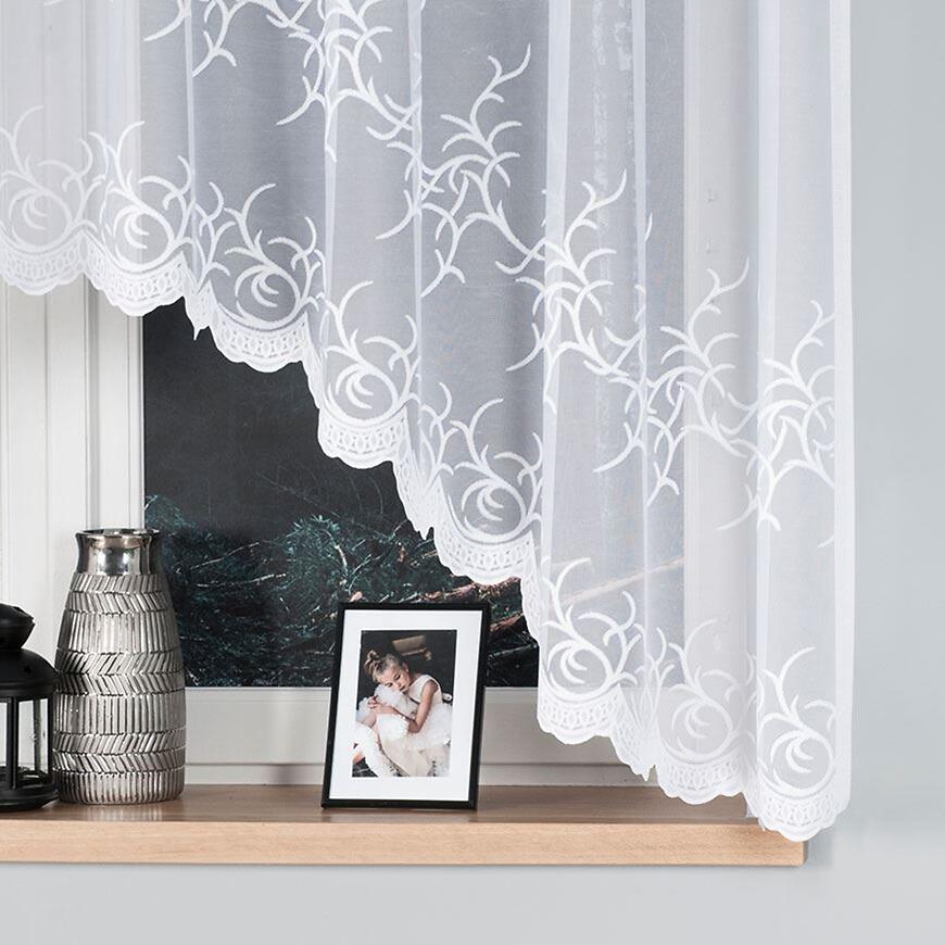 Forma firany w łuk nadaje oknu lekkości i sprawia, że całość prezentuje się estetycznie zarówno w kuchni, jak i w salonie czy jadalni. Dzięki szerokości 320 cm firana dobrze układa się na karniszu, tworząc efektowną oprawę okna.