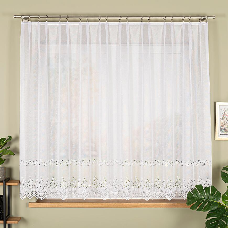 Model w formie firany prostej prezentuje się estetycznie w salonie, kuchni czy jadalni. Szerokość 300 cm pozwala na naturalne ułożenie tkaniny na karniszu, tworząc elegancką i uniwersalną dekorację okna.