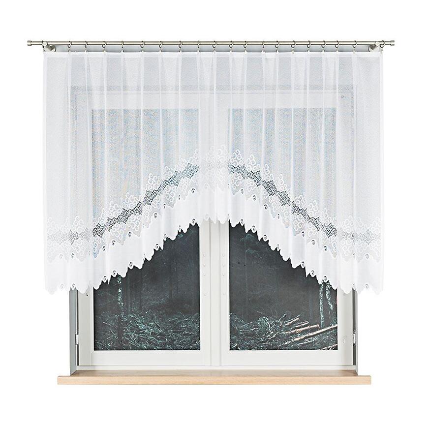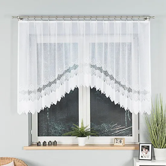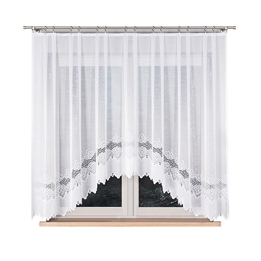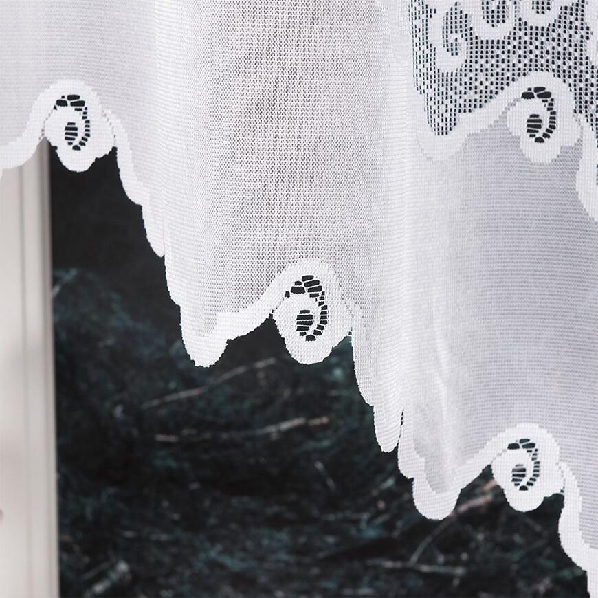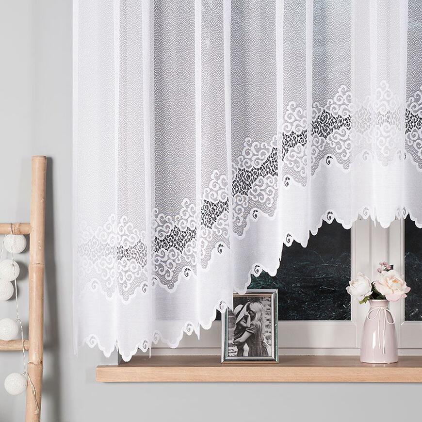 Model w formie firany w łuk pięknie prezentuje się w salonie, kuchni lub jadalni. Szerokość 300 cm pozwala na naturalne ułożenie materiału na karniszu, tworząc efektowną i elegancką dekorację okna, która subtelnie rozprasza światło.