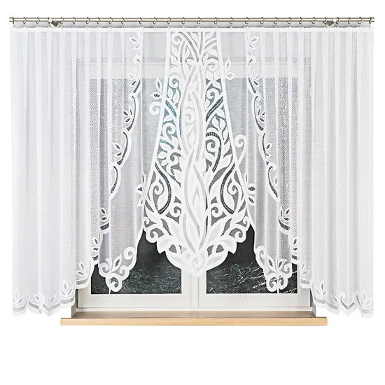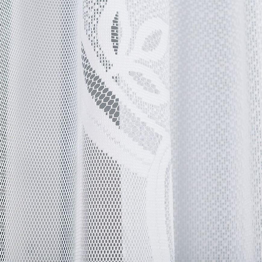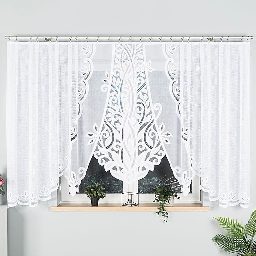 Model w formie firany w łuk pięknie prezentuje się w salonie, kuchni lub jadalni. Szerokość 400 cm pozwala na naturalne ułożenie tkaniny na karniszu, tworząc efektowną i estetyczną dekorację okna, która subtelnie rozprasza światło.