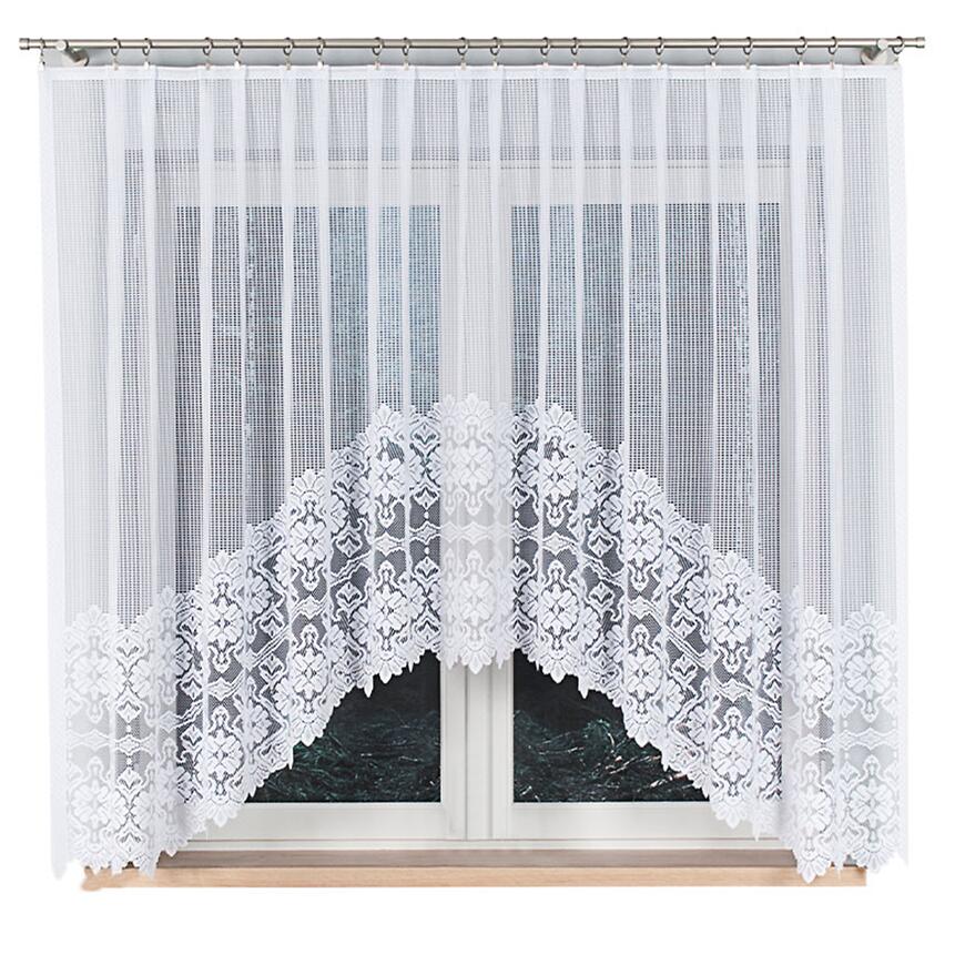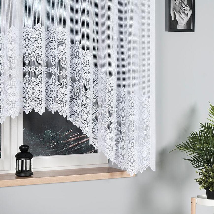 Model w formie firany w łuk pięknie prezentuje się w salonie, kuchni lub jadalni. Szerokość 310 cm pozwala na naturalne ułożenie materiału na karniszu, tworząc efektowną i estetyczną dekorację okna, która subtelnie rozprasza światło.