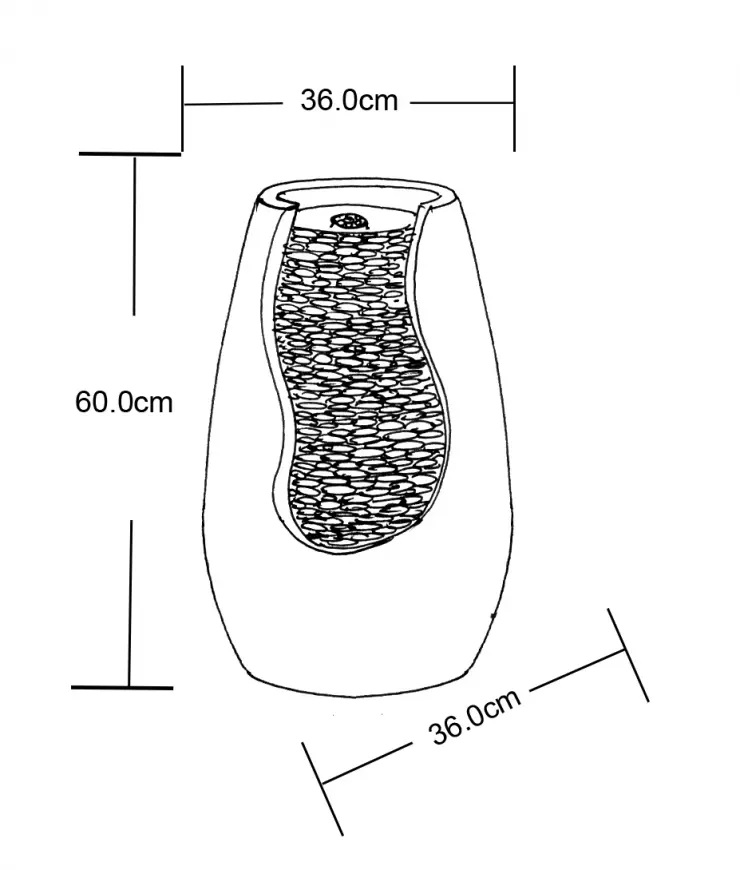 Fontanna ma wymiary 60 cm wysokości i 36 cm szerokości, co sprawia, że jest idealnie proporcjonalna – na tyle duża, aby przyciągać wzrok, ale jednocześnie na tyle kompaktowa, by nie przytłaczać przestrzeni, w której się znajduje. Zasilana zasilaczem 230V/12V, fontanna jest nie tylko bezpieczna w użytkowaniu, ale także energooszczędna, co jest istotnym aspektem dla osób dbających o środowisko.
