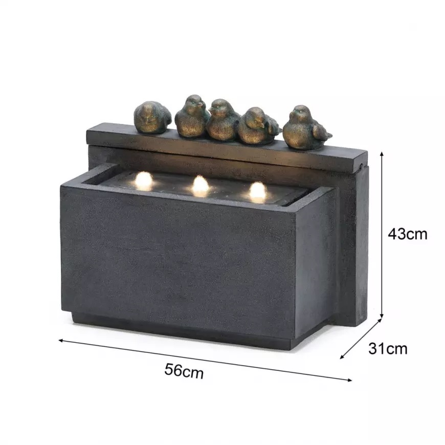 Fontanna posiada wbudowane oświetlenie LED, które nadaje jej wyjątkowy, nastrojowy charakter, szczególnie po zmroku. Subtelne światło LED podkreśla przepływającą wodę, tworząc niepowtarzalny efekt wizualny i dodając magii każdej przestrzeni. Zasilacz o parametrach 230V/12V gwarantuje bezpieczne użytkowanie zarówno na zewnątrz, jak i wewnątrz budynków.