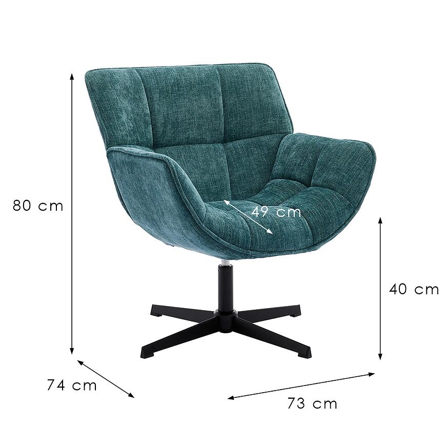 Projektując fotel, zadbano o proporcje sprzyjające komfortowemu wypoczynkowi. Wysokość całkowita fotela wynosi 80 cm, szerokość 73 cm, a głębokość 74 cm, co zapewnia odpowiednią przestrzeń do swobodnego siedzenia. Wysokość siedziska na poziomie 40 cm oraz głębokość siedziska 49 cm pozwalają przyjąć wygodną, naturalną pozycję ciała.