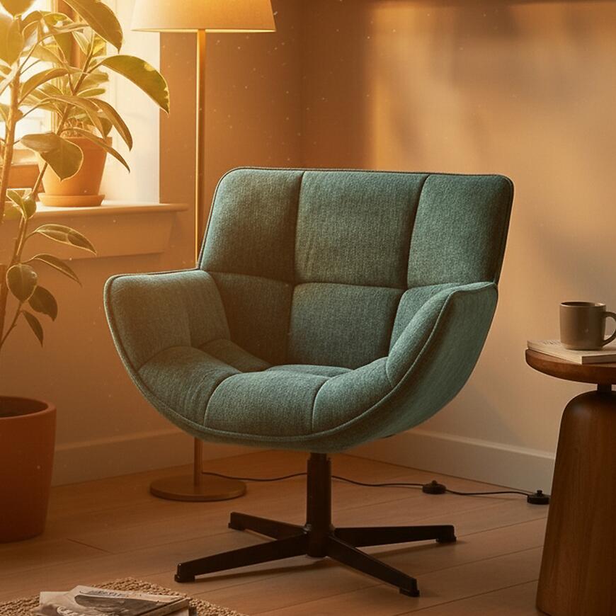 Fotel obrotowy Ambra to propozycja dla osób, które poszukują połączenia estetyki, wygody oraz praktycznych rozwiązań do nowoczesnych wnętrz. Model ten doskonale odnajduje się w salonie, pokoju dziennym, kąciku wypoczynkowym, a także w eleganckim gabinecie lub strefie relaksu. Zielona kolorystyka tapicerki wprowadza do wnętrza spokój i naturalny akcent, jednocześnie dobrze komponując się z jasnymi, jak i ciemniejszymi aranżacjami.