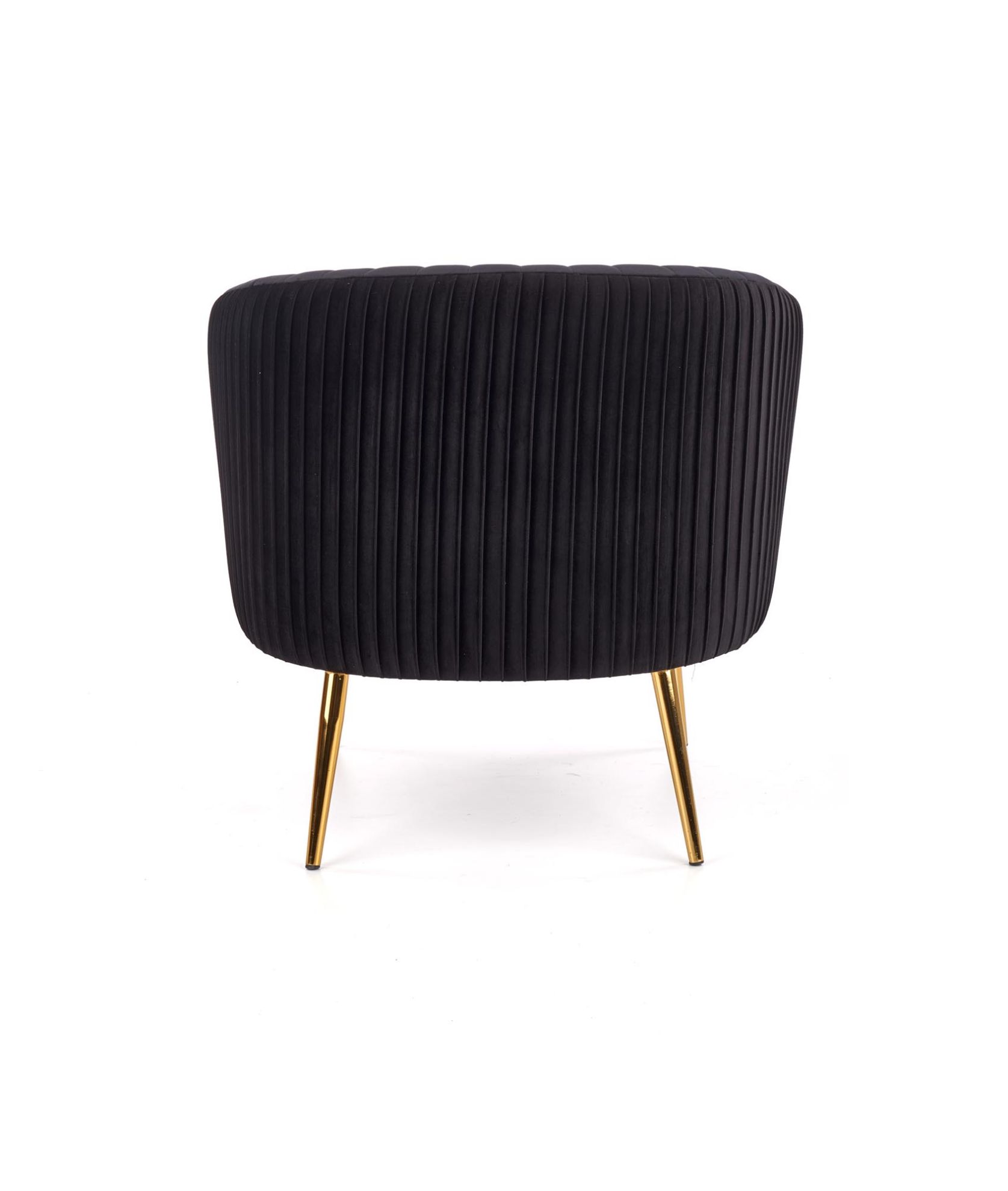 Fotel Amy to połączenie elegancji i komfortu, idealne do nowoczesnych wnętrz. Jego wymiary wynoszą 78 cm wysokości, 72 cm szerokości, 80 cm głębokości oraz wysokość siedziska 45 cm, zapewniając wygodne użytkowanie. Tapicerka wykonana jest z wysokiej jakości tkaniny w eleganckim czarnym kolorze, który doskonale komponuje się z nowoczesnym stylem wnętrza. Nogi fotela wykonane są ze stali chromowanej, nadając mu stabilność i solidność. Kontrastowe złote wykończenie nóg dodaje fotelowi Amy wyjątkowego charakteru, idealnie pasującego do współczesnych trendów w aranżacji przestrzeni.