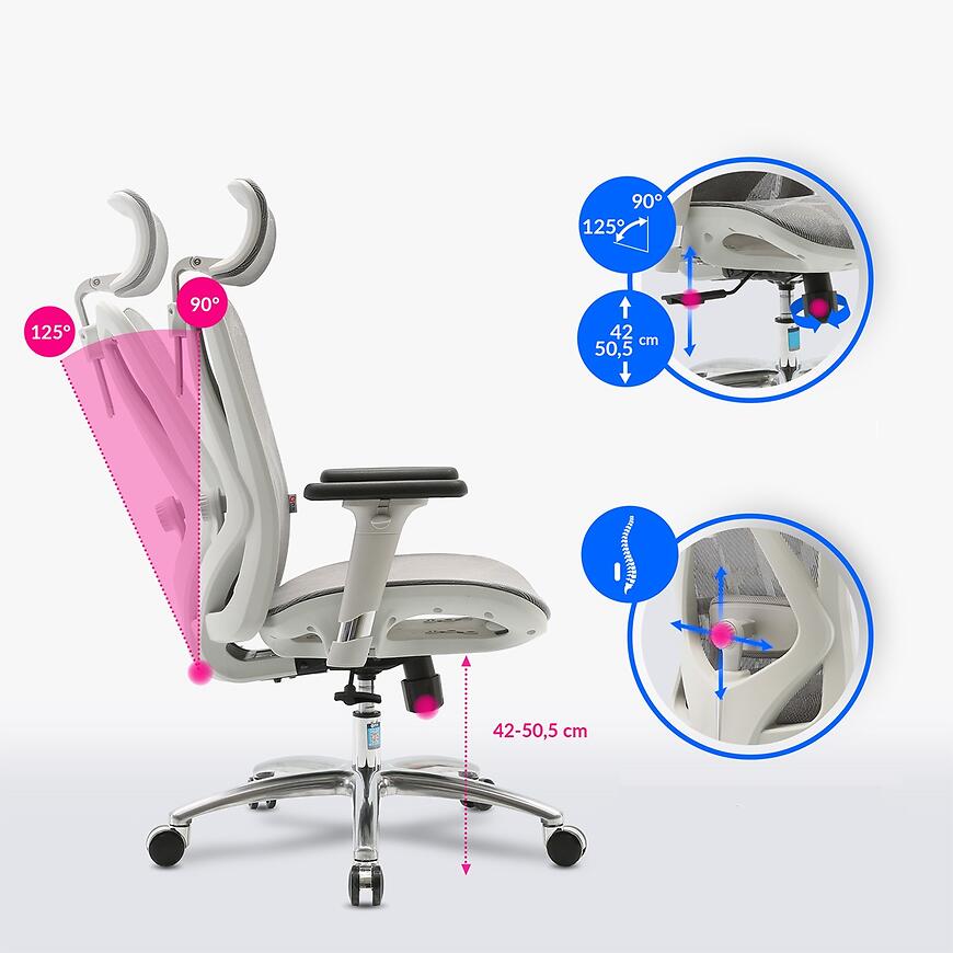 Fotel Biurowy Angel Kalisto Szary to ergonomiczny i funkcjonalny fotel, który łączy komfort, trwałość i nowoczesny design. Wyposażony w regulowane podłokietniki, zagłówek oraz mechanizm regulacji oparcia, umożliwia idealne dopasowanie pozycji do indywidualnych potrzeb użytkownika. Konstrukcja z siatki i metalu zapewnia stabilność, wentylację i bezpieczeństwo, a maksymalne obciążenie 150 kg podkreśla jego wytrzymałość. Fotel oferuje regulację wysokości siedziska od 42 do 51 cm oraz wysokość całkowitą od 105 do 115 cm, co pozwala na optymalne dopasowanie do przestrzeni. Szara tapicerka z siatki nadaje mu nowoczesny i elegancki wygląd, łącząc funkcjonalność z estetyką.