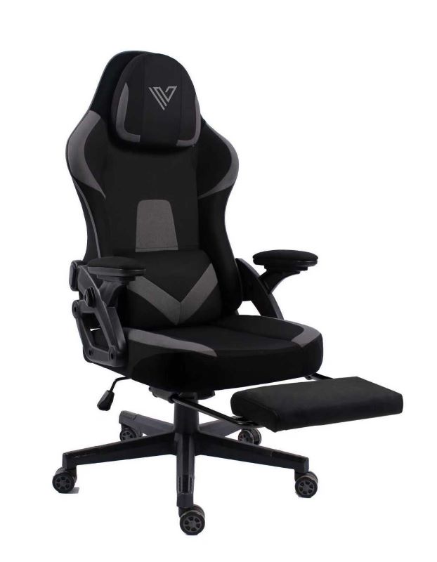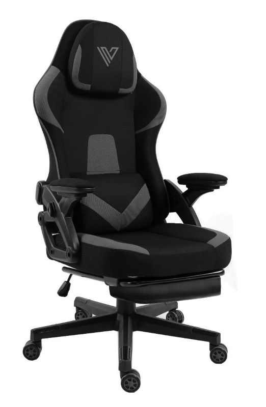 Siedzisko i oparcie fotela wykonane z tkaniny w kolorze czarno/szarym. Kubełkowy kształt oparcia, wyposażony w mechanizm 2-dźwigniowy pozwalający na blokadę fotela w dowolnej pozycji, możliwość wychylenia oparcie do 150 stopni, fotel posiada regulowane poduszki podpierajace lędźwie i szyję. Kółka z oponka do twardych powierzchni nie rysujace podłogi. Rozkładane podłokietniki z tapicerowanymi nakładkami, podstawa racingowa. Wysuwany podnóżek. Fotel regulowany góra/dół, zintegrowany tapicerowany zagłówek.