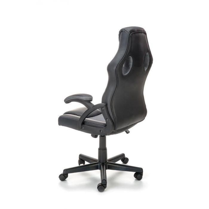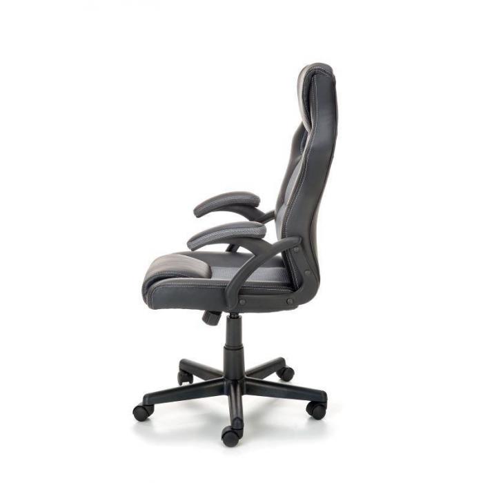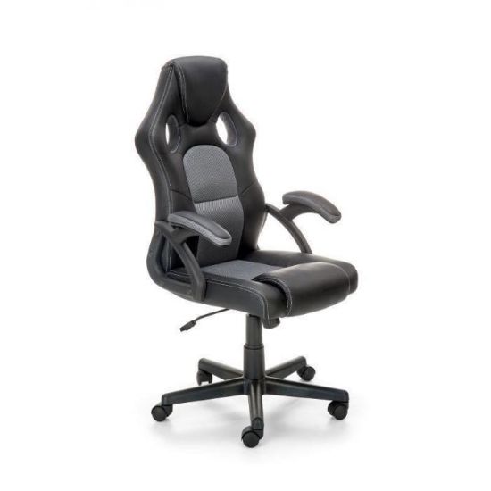 Tapicerkę fotela stanowi wysokogatunkowa skóra ekologiczna gładka typu skaj. Model dostępny w dwóch kolorach: czarno-popielatym oraz czarno-czerwonym. Oparcie jest wyprofilowane i wyposażone w specjalną wajchę, która pozwala na rozłożenie go do tyłu. Taka opcja w połączeniu ze zintegrowanym z siedziskiem mechanizmem TILT daje użytkownikowi naprawdę duże możliwości regulacji fotela. Oparcie posiada również dwa modne wloty. To charakterystyczny akcent często spotykany w nowoczesnych modelach foteli. Wytrzymała podstawa jezdna typu krzyżak wykonana została z lakierowanego tworzywa sztucznego. Model wyposażony jest w mechanizm TILT, który umożliwia użytkownikowi kołysanie się w fotelu (to duża zaleta, ponieważ przechylenie się do tyłu zapewnia optymalne krążenie krwi oraz zwalnia napięcie w naszych udach), blokadę oparcia w optymalnej (pionowej) pozycji do pracy, regulację wysokości siedziska i obrót o 360°.