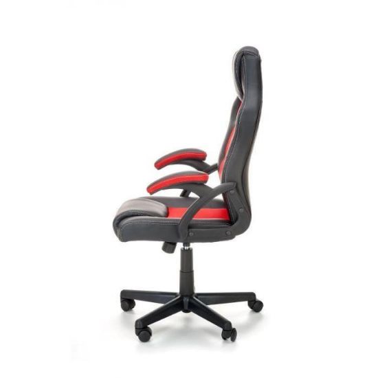 Tapicerkę fotela stanowi wysokogatunkowa skóra ekologiczna gładka typu skaj. Model dostępny w dwóch kolorach: czarno-popielatym oraz czarno-czerwonym. Oparcie jest wyprofilowane i wyposażone w specjalną wajchę, która pozwala na rozłożenie go do tyłu. Taka opcja w połączeniu ze zintegrowanym z siedziskiem mechanizmem TILT daje użytkownikowi naprawdę duże możliwości regulacji fotela. Oparcie posiada również dwa modne wloty. To charakterystyczny akcent często spotykany w nowoczesnych modelach foteli. Wytrzymała podstawa jezdna typu krzyżak wykonana została z lakierowanego tworzywa sztucznego. Model wyposażony jest w mechanizm TILT, który umożliwia użytkownikowi kołysanie się w fotelu (to duża zaleta, ponieważ przechylenie się do tyłu zapewnia optymalne krążenie krwi oraz zwalnia napięcie w naszych udach), blokadę oparcia w optymalnej (pionowej) pozycji do pracy, regulację wysokości siedziska i obrót o 360°.
