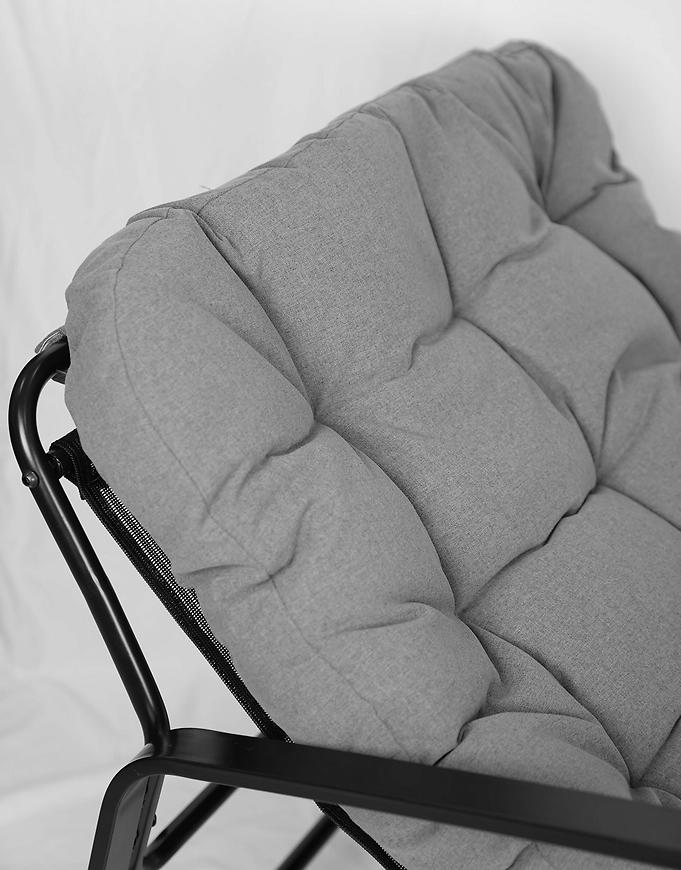 W komplecie z fotelem znajduje się również grubo wypełniona poduszka w kolorze szarym, która zapewnia dodatkowe podparcie dla pleców i głowy, umożliwiając pełen komfort podczas odpoczynku na świeżym powietrzu.
