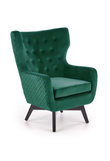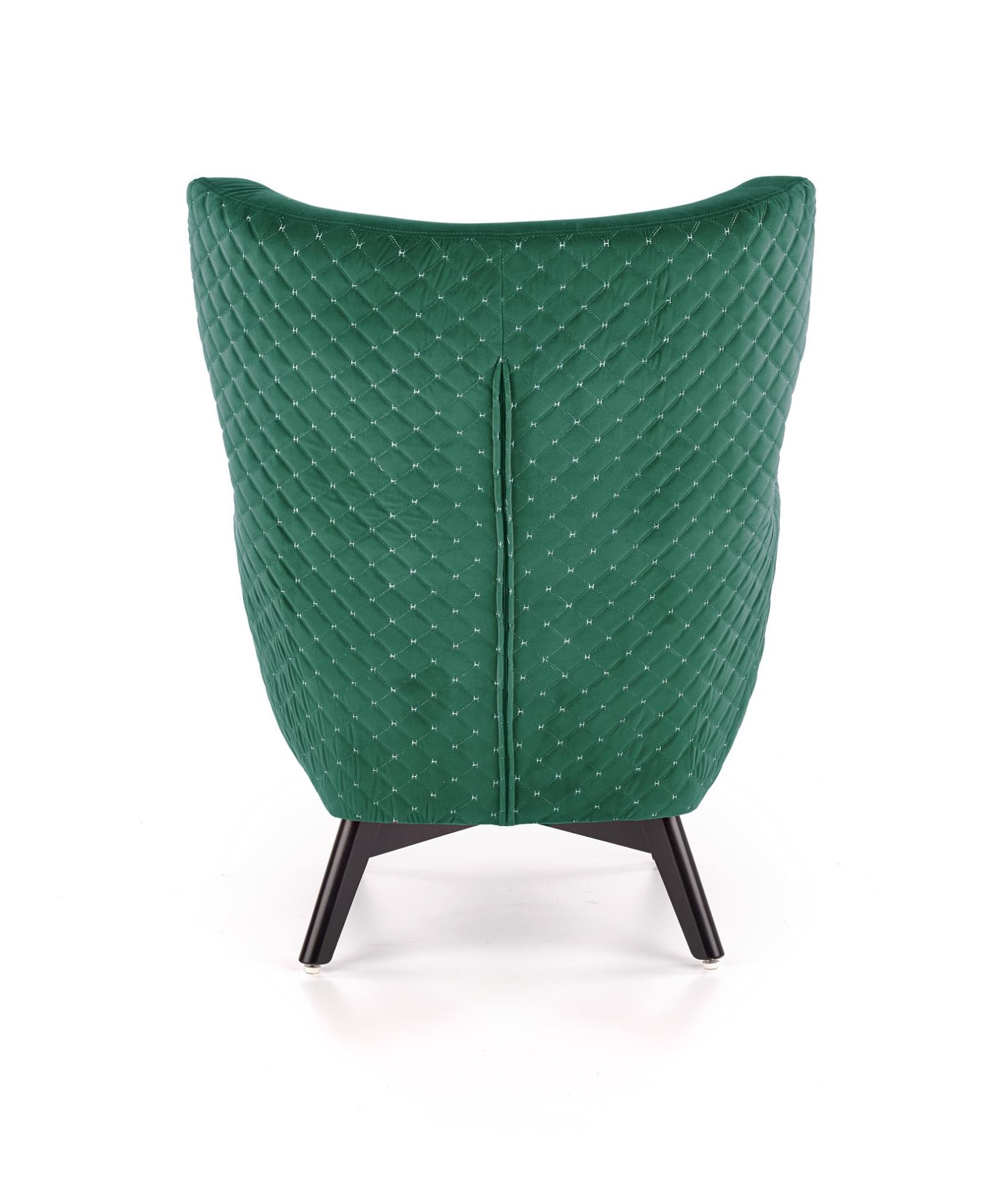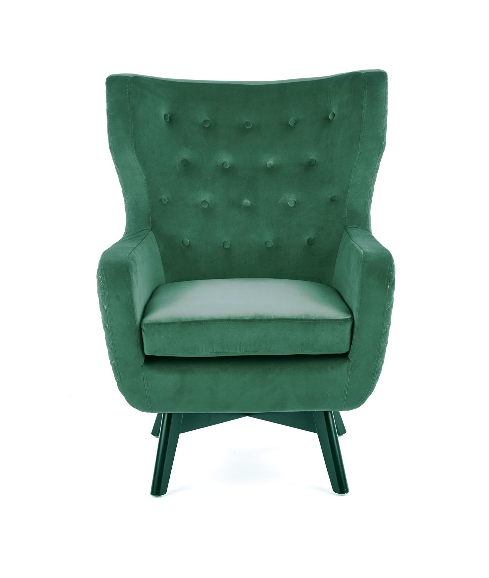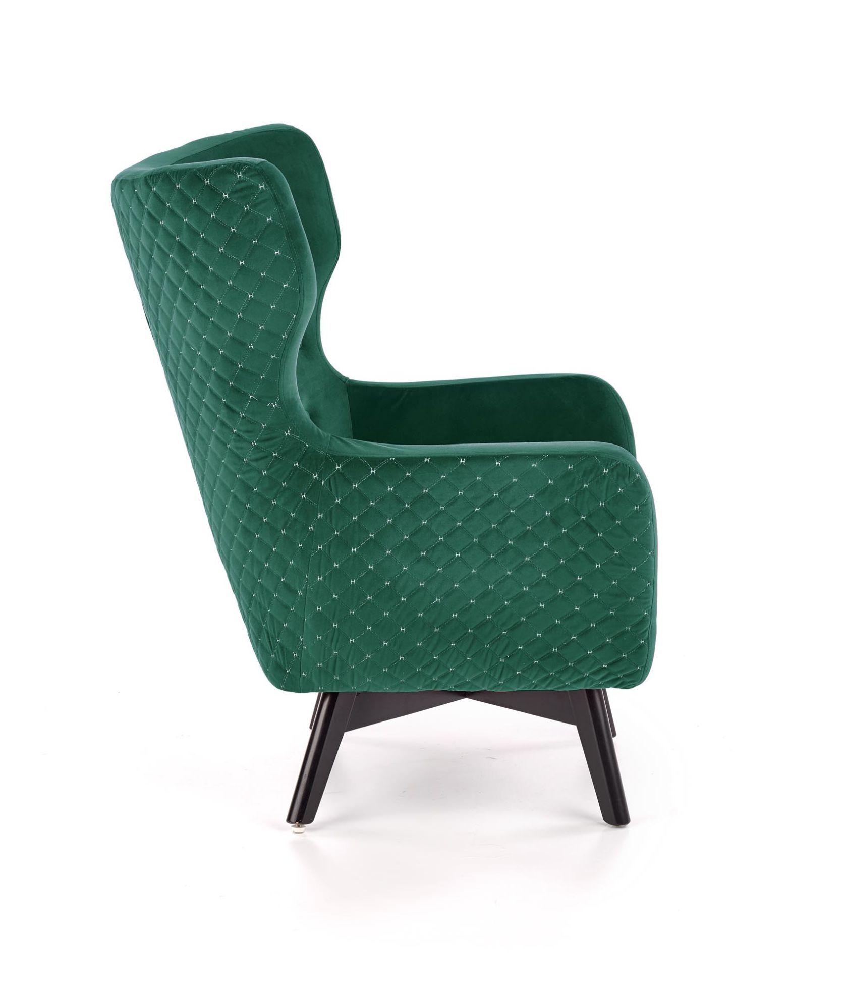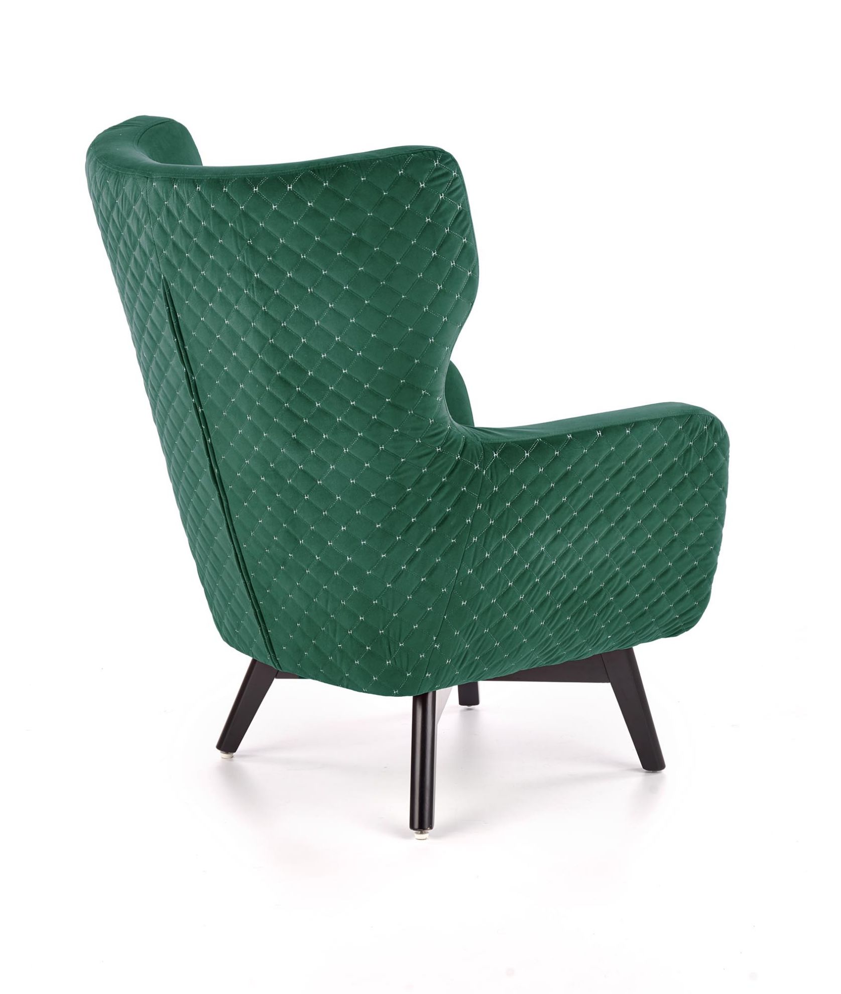 Fotel został obity wytrzymałą tkaniną w odcieniu ciemny zielony (HLR 57), która doskonale komponuje się z różnorodnymi aranżacjami, od klasycznych po bardziej nowoczesne. Neutralny kolor tapicerki wprowadza spokojny akcent, który pasuje do wielu stylów wnętrzarskich, a zarazem nadaje wnętrzu przytulny charakter. Nogi wykonane z litego drewna w czarnym kolorze dodają całości elegancji i stabilności, a także stanowią interesujący kontrast z jasną tapicerką.