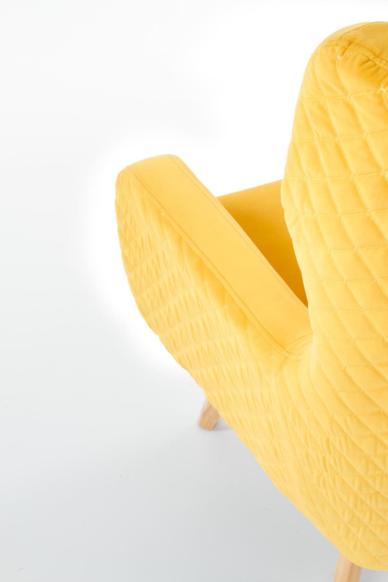 Fotel został obity wytrzymałą tkaniną w odcieniu żółtym, która doskonale komponuje się z różnorodnymi aranżacjami, od klasycznych po bardziej nowoczesne. Neutralny kolor tapicerki wprowadza spokojny akcent, który pasuje do wielu stylów wnętrzarskich, a zarazem nadaje wnętrzu przytulny charakter. Nogi wykonane z litego drewna w naturalnym kolorze dodają całości elegancji i stabilności, a także stanowią interesujący kontrast z jasną tapicerką.