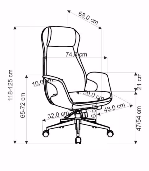 Regulowana wysokość siedziska (47-54 cm) oraz oparcia (118-125 cm) pozwala na dostosowanie fotela do różnych typów biurek i wysokości użytkowników. Szerokie i głębokie siedzisko (74/68 cm) zapewnia przestrzeń i komfort, pozwalając na swobodne ułożenie się podczas siedzenia.