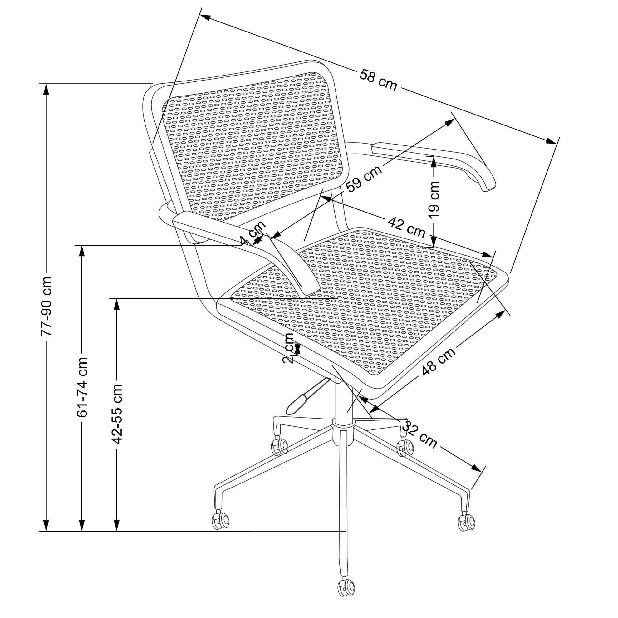 Fotel posiada wymiary 59 cm szerokości, 58 cm głębokości i regulowaną wysokość od 77 do 90 cm. Dzięki możliwości regulacji wysokości, fotel można dopasować do swoich preferencji, zapewniając optymalne wsparcie dla kręgosłupa. Regulacja wysokości umożliwia także dopasowanie do wysokości biurka lub stołu, co przyczynia się do utrzymania ergonomii pracy. Wysokość do siedziska o wymiarach 42-55 cm oferuje komfortowe miejsce do siedzenia, a obrotowa podstawa umożliwia swobodne poruszanie się wokół biurka.