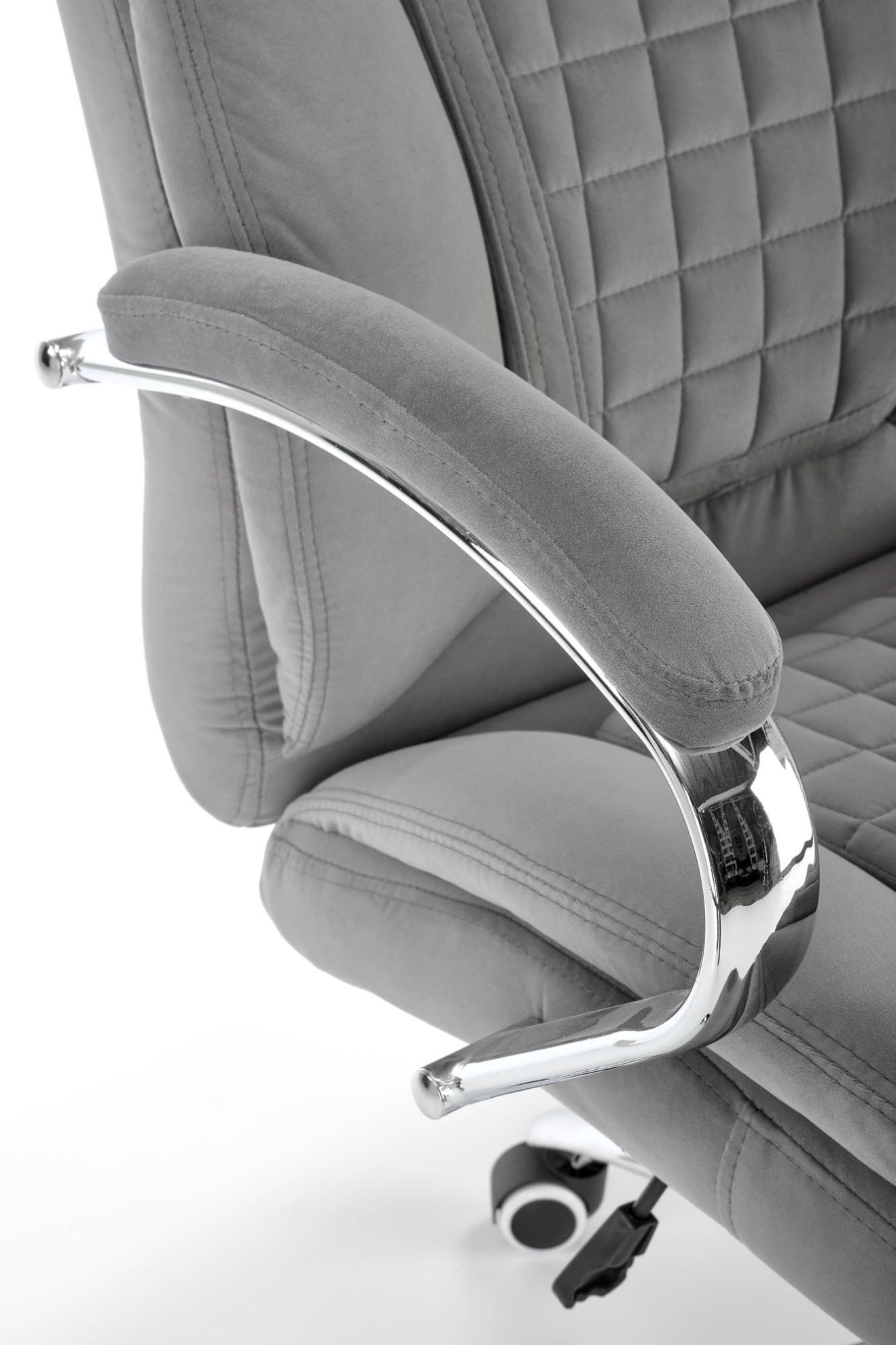 Tapicerka fotela wykonana jest z miękkiej i przyjemnej w dotyku tkaniny velvet w eleganckim, popielatym odcieniu. Ten subtelny kolor nadaje fotelowi wyrafinowanego charakteru i dodaje profesjonalnego wyglądu gabinetowi.