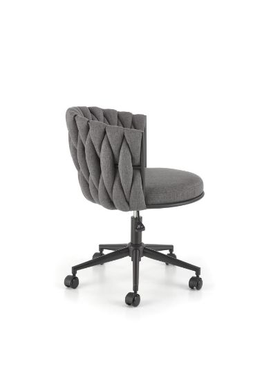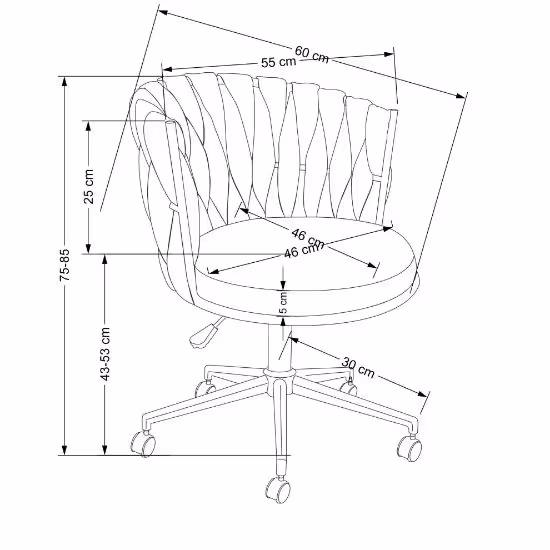 Fotel posiada wymiary 55 cm szerokości, 60 cm głębokości i regulowaną wysokość od 75 do 85 cm. Dzięki możliwości regulacji wysokości, fotel można dopasować do swoich preferencji, zapewniając optymalne wsparcie dla kręgosłupa. Regulacja wysokości umożliwia także dopasowanie do wysokości biurka lub stołu, co przyczynia się do utrzymania ergonomii pracy. Wysokość do siedziska o wymiarach 43-53 cm oferuje komfortowe miejsce do siedzenia, a obrotowa podstawa umożliwia swobodne poruszanie się wokół biurka.