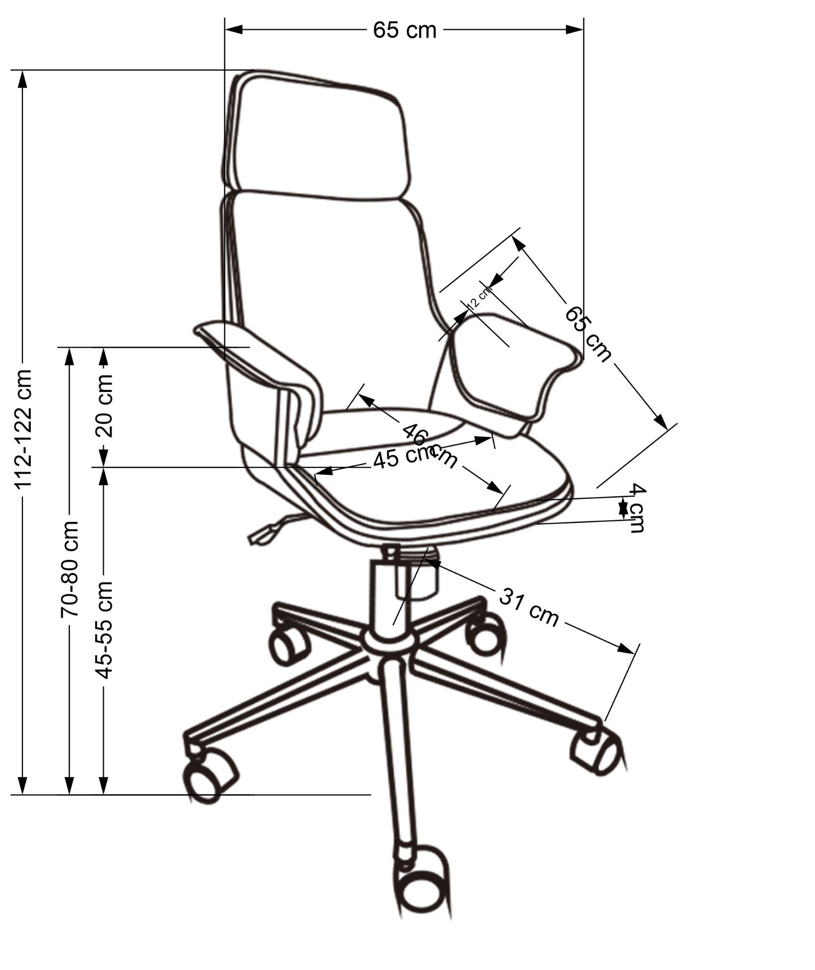 Fotel posiada solidną konstrukcję wykonaną z trwałej sklejki giętej, o szerokości 65 cm, głębokości 65 cm i regulowanej wysokości od 112 do 122 cm. Regulacja wysokości umożliwia dopasowanie fotela do indywidualnych preferencji, zapewniając optymalne wsparcie dla pleców. Dzięki temu można znaleźć wygodną pozycję siedzenia, która pozwoli na komfortową pracę lub naukę. Wysokość do siedziska o wymiarach 45-55 cm oferuje komfortowe miejsce do siedzenia, a obrotowa podstawa umożliwia swobodne poruszanie się wokół biurka.
